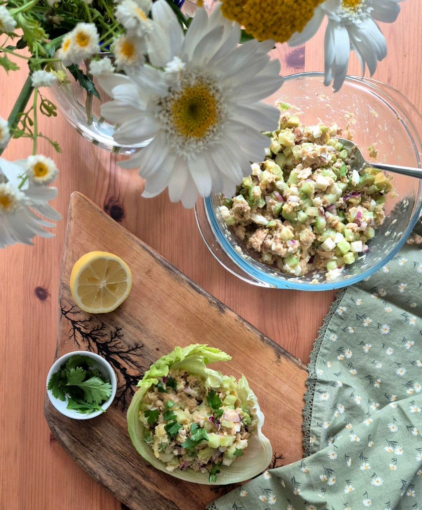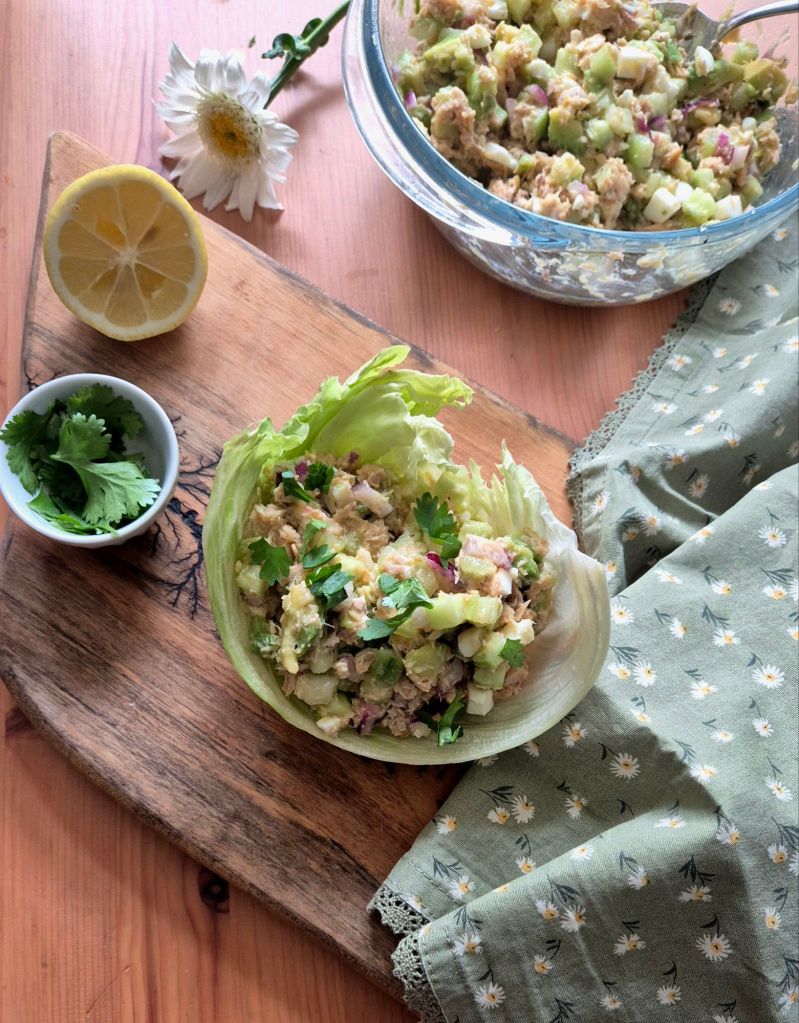 Компания на рибата правят авокадо, варено яйце, селъри и краставица. Салата е подправена с лимонов сок и пресен кориандър, които й придават особена свежест. Не добавих допълнотелно мазнина, понеже зехтинът от консервите и авокадото са напълно достатъчни.