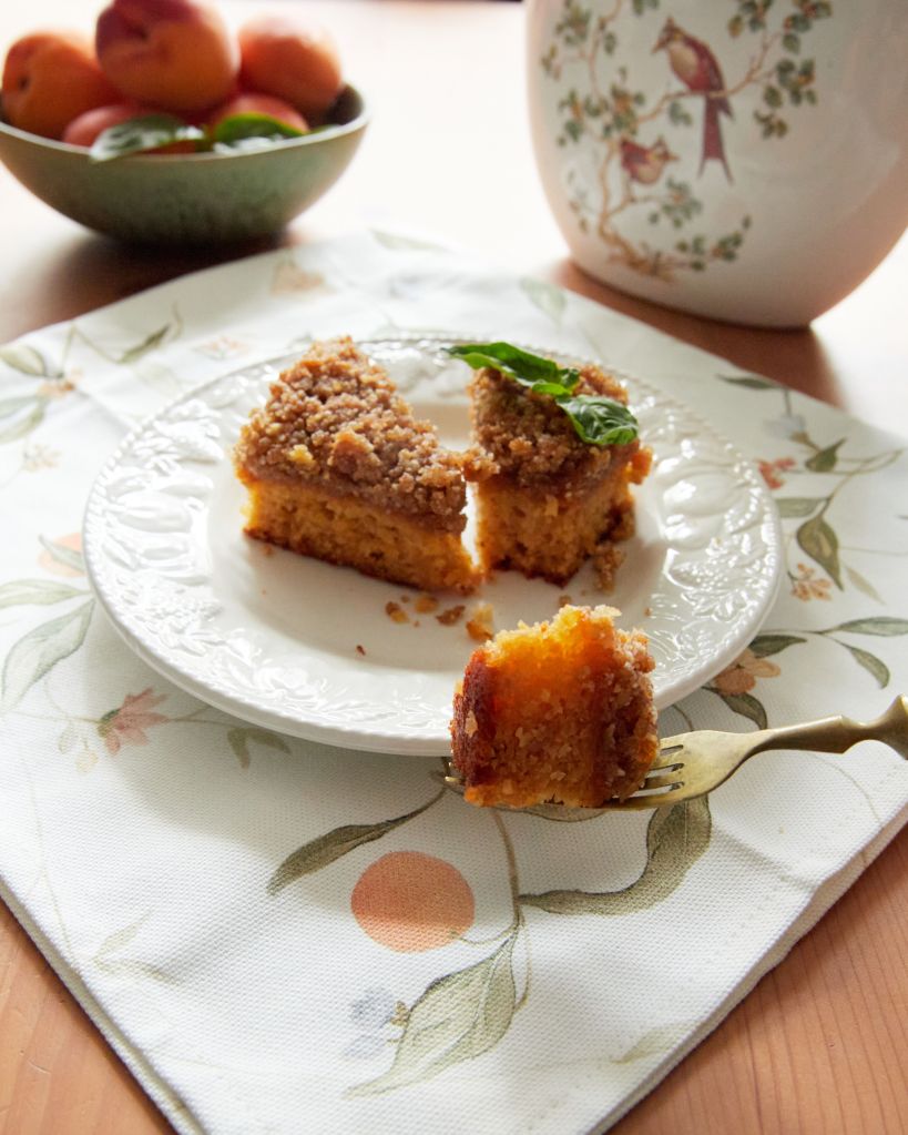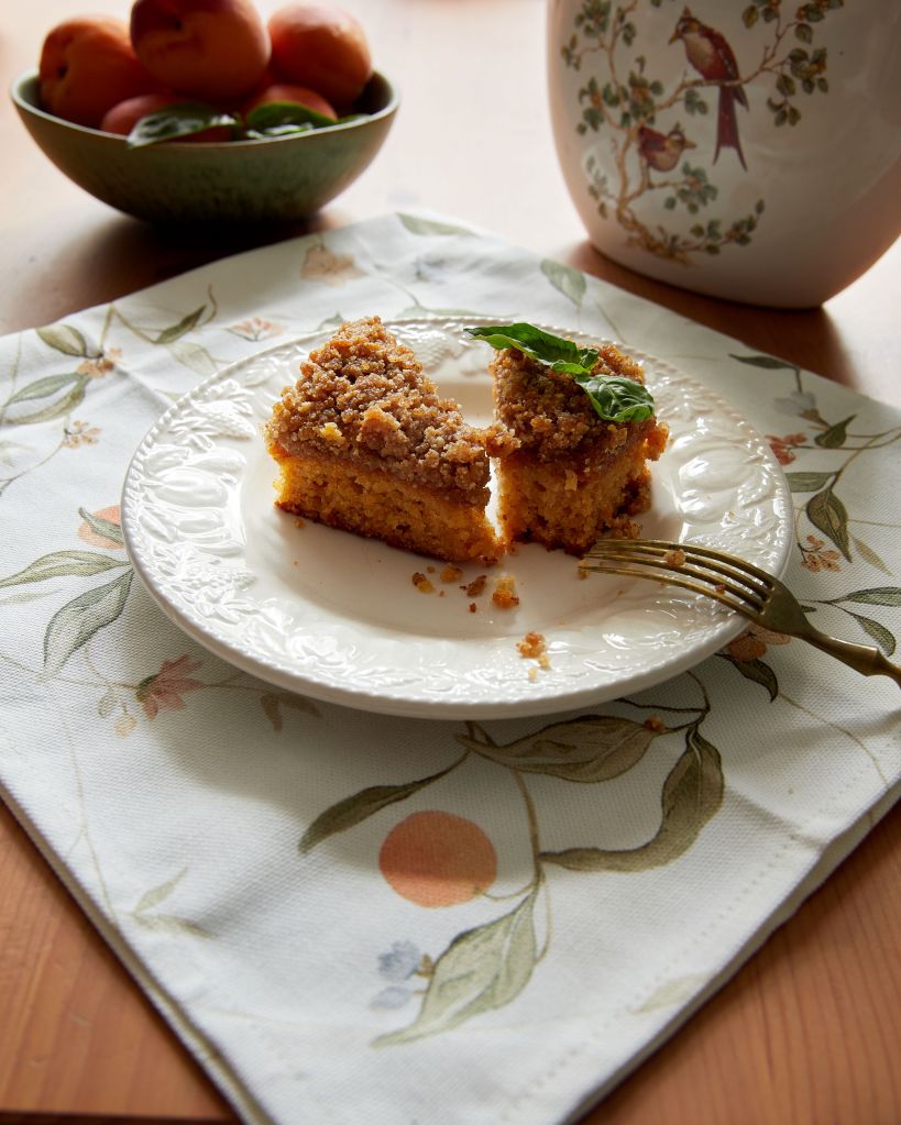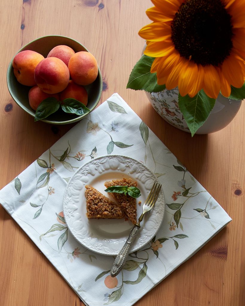 Затова се спрях на този вариант – мека и сочна основа от безглутеново и ниско въглехидратно тесто с извара и зехтин, слой мармалад и хрупкав кръмбъл с предварително препечен флейкс от елда. Добавих и листенца босилек, който прекрасно се комбинира с кайсиите за един неустоимо ароматен летен десерт.