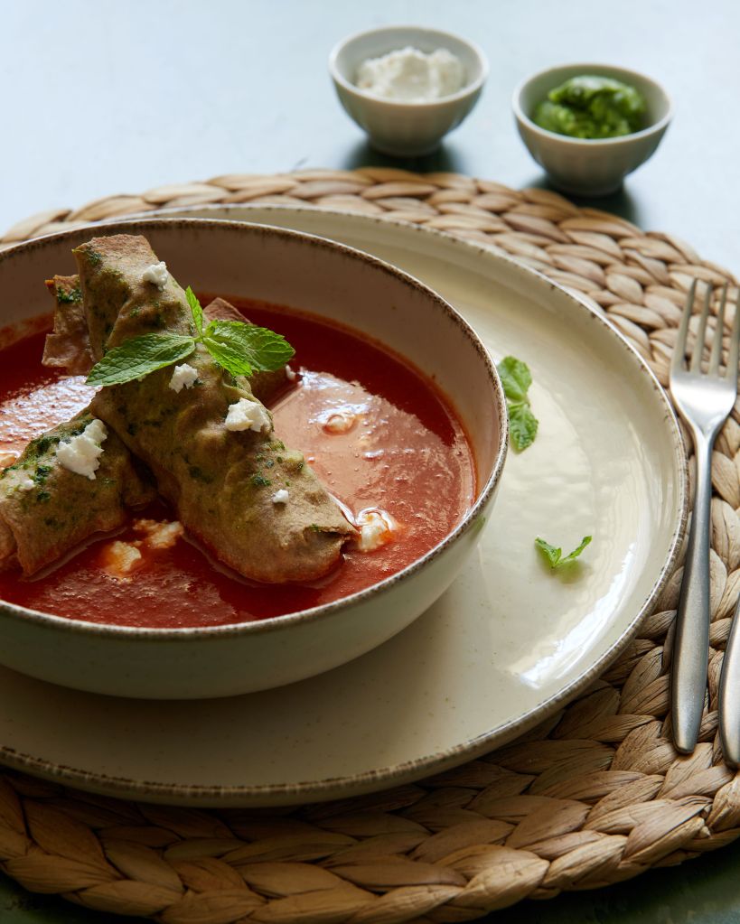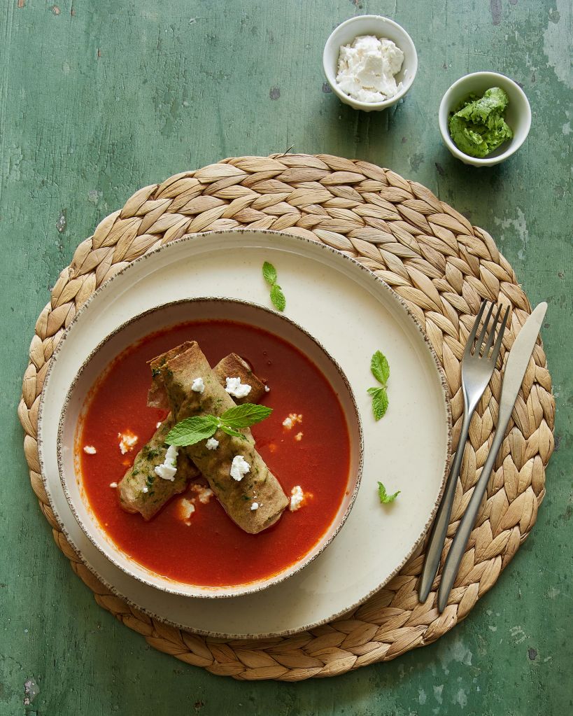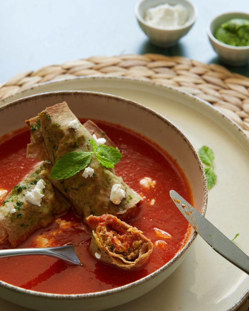 Пълнежът е от тиквички, моркови и нискомаслена извара, подправени със солта с чесън и билки на Спайзинг. Използвах ръчно точени кори на Канап за оформяне на рулцата и вместо в тиган с мазнина, ги сготвих в air fryer, след което ги намазах с масло с левурда.
