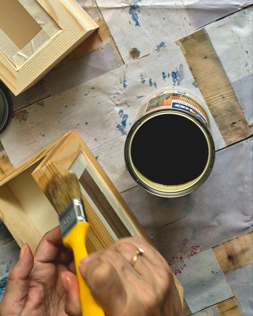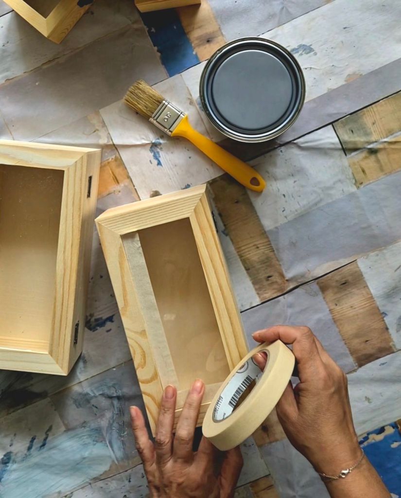 За сметка на това се наложи да лакирам кутиите, понеже бяха груби на допир и доста бледи. Два пласта лак оправиха нещата, но се наложи да изчакам да изсъхнат добре. Лакът е най-обикновен, прозрачен за дърво от кварталната железария. Взех и тиксо за маскиране, за да предпазя стъклото от лака.