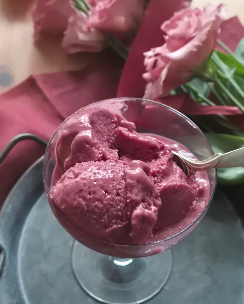 И така ми дойде идеята за тази рецепта. Сложих наличните замразени плодове (800 г) – смес от ананас, манго, малини и диви боровинки. Вие може да промените микса според вкуса и наличностите. Добавих протеин с аромат ванилия и бадемов тахан. Разредих с новонабавената кокосова вода, но умерено, за да получа желаната консистенция. Замразих във фризера и voila – имаме прекрасен на вкус, цвят и консистенция кремообразен сладолед, който има 10 г протеин в порция и само 135 калории. Идеалният летен десерт, с който да завършите обяда или вечерята си.