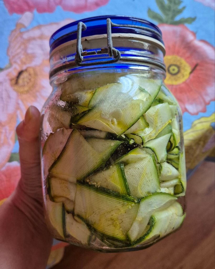 Ако решите да пробвате моята идея, можете да приготвите мариноаните тиквички по този начин. С мандолина или картофобелачка (моя избор) нарежете тиквичката (предварително измита, краищата отстранени) на тънки ленти по дължина. Смесете всички останали съставки в купа и разбъркайте добре. Сложете тиквичките в буркан или друг съд с плътно затварящ се капак и добавете маринатата. Затворете и разклатете внимателно. Оставете да се маринова поне 30 минути.
