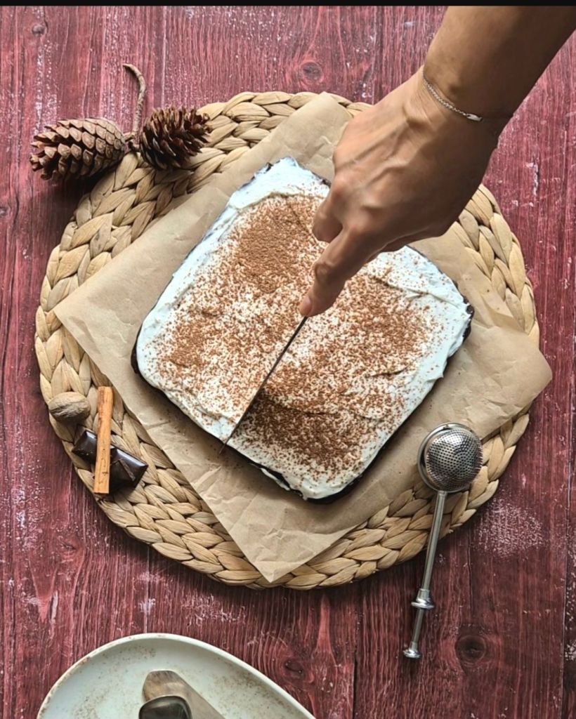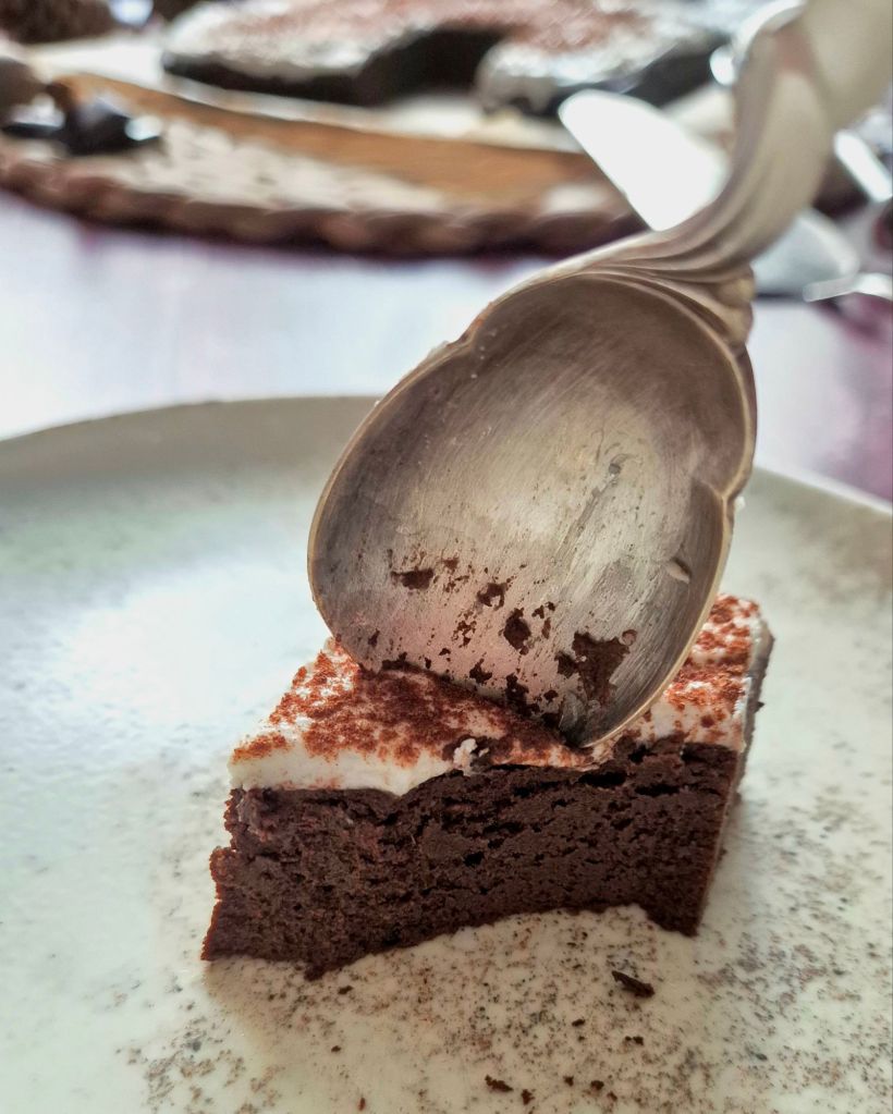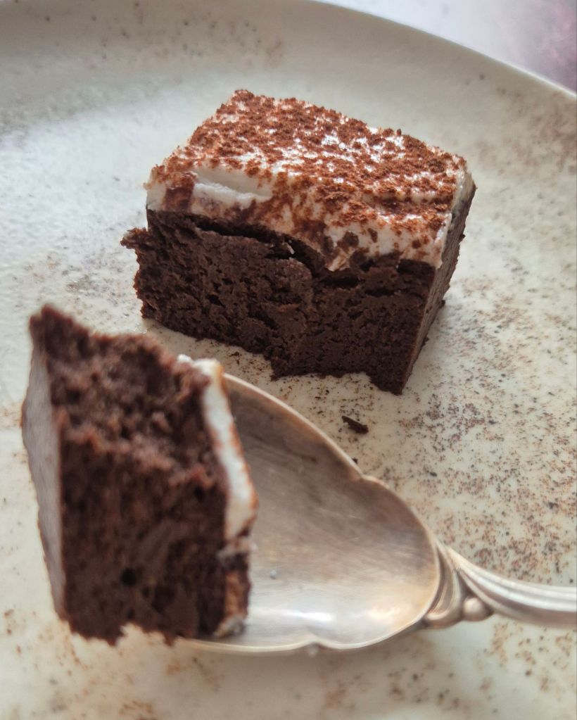 Първо разгледах идеите за вкусови съчетания и се спрях на черен шоколад, канела, индийско орехче и козе сирене. Което сочеше към брауни. Бях виждала рецепти с патладжан и в пространството има доста идеи. Намерих си подходяща, в която направих малки промени и добавих глазура от меко козе сирене (може да бъде и козя извара). Резултатът е просто УАУ. Ако обичате наситеният вкус на тъмен шоколад и не се страхувате от необичайни комбинации, задължително трябва да пробвате тази рецепта.
