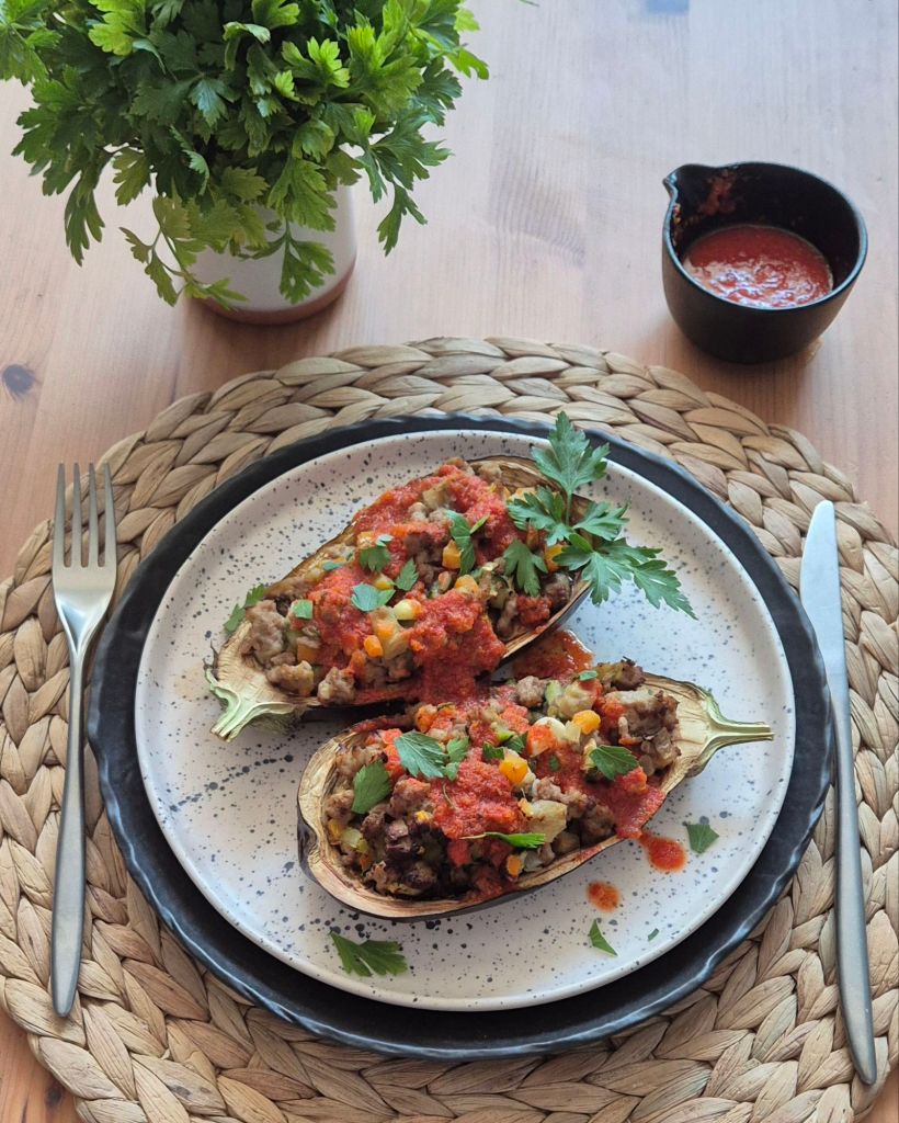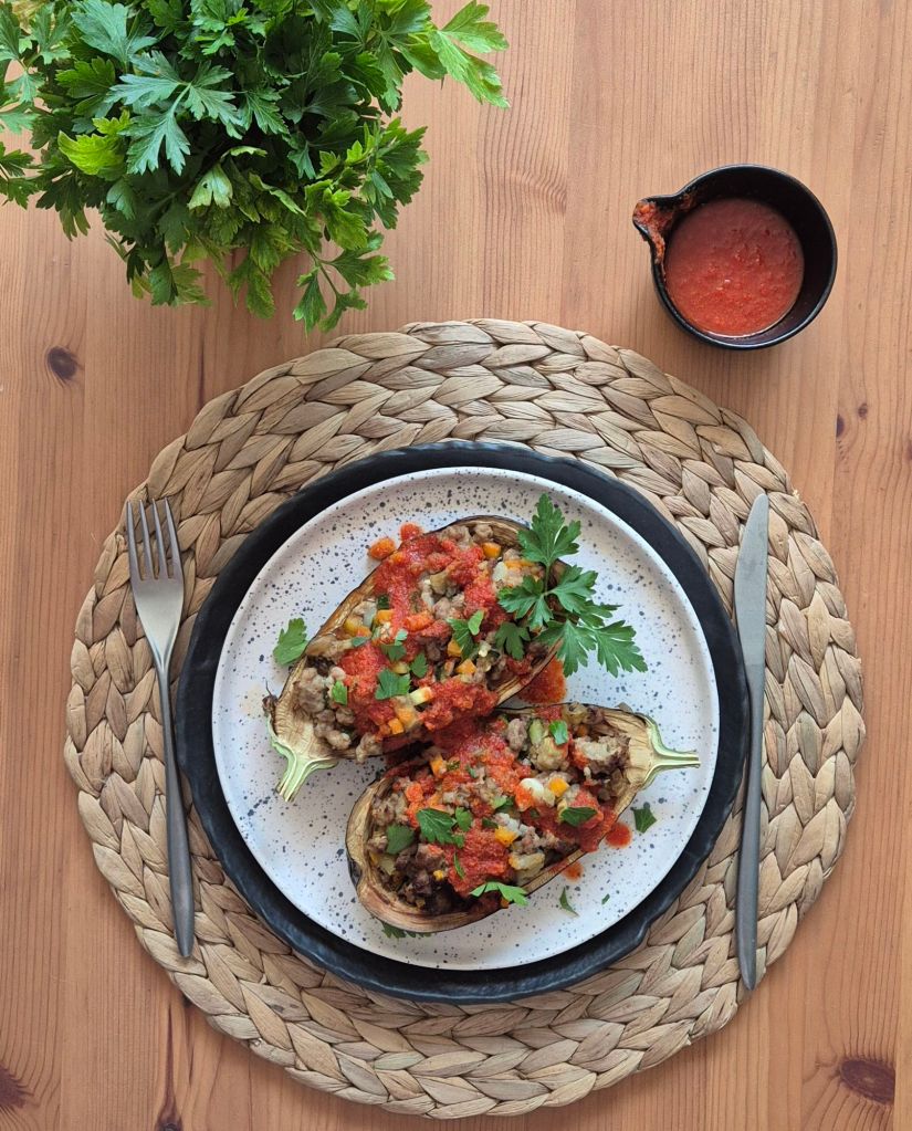 Зеленчуците – лук, моркови, тиквички и вътрешността на патладжаните нарязах на дребни кубчета и ги задуших с месото. Самите патладжани запекох на air fryer и след това напълних. Подправих със солта с чесън и билки на Спайзинг и сервирах с домашен сос маринара и пресен магданоз.