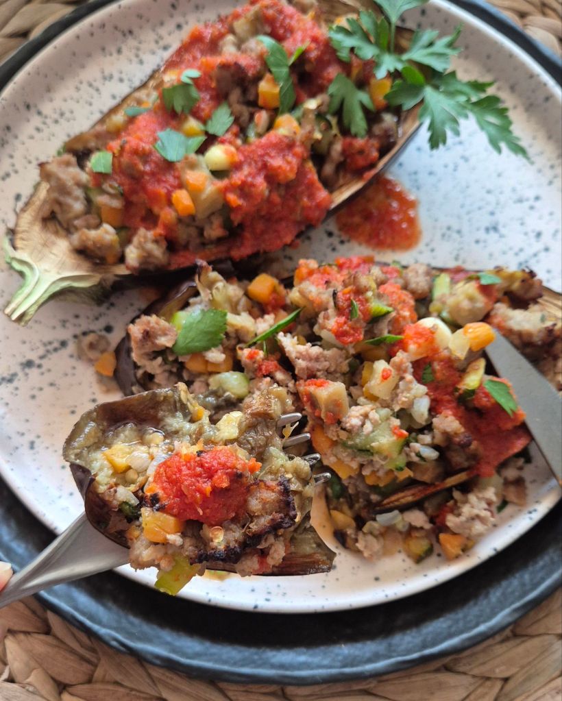 Ако обичате патладжани, тази рецепта е за вас. Тук ги напълних с плънка от зеленчуци и пуешко за максимално диетичен ефект – 42 г протеин и 11 г фибри в една порция. Но рецептата може лесно да се веганизира, като замените месото с предварително сварен нахут или леща.