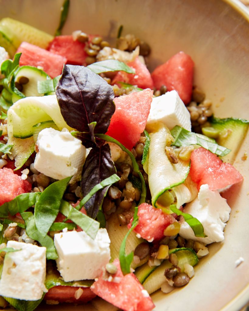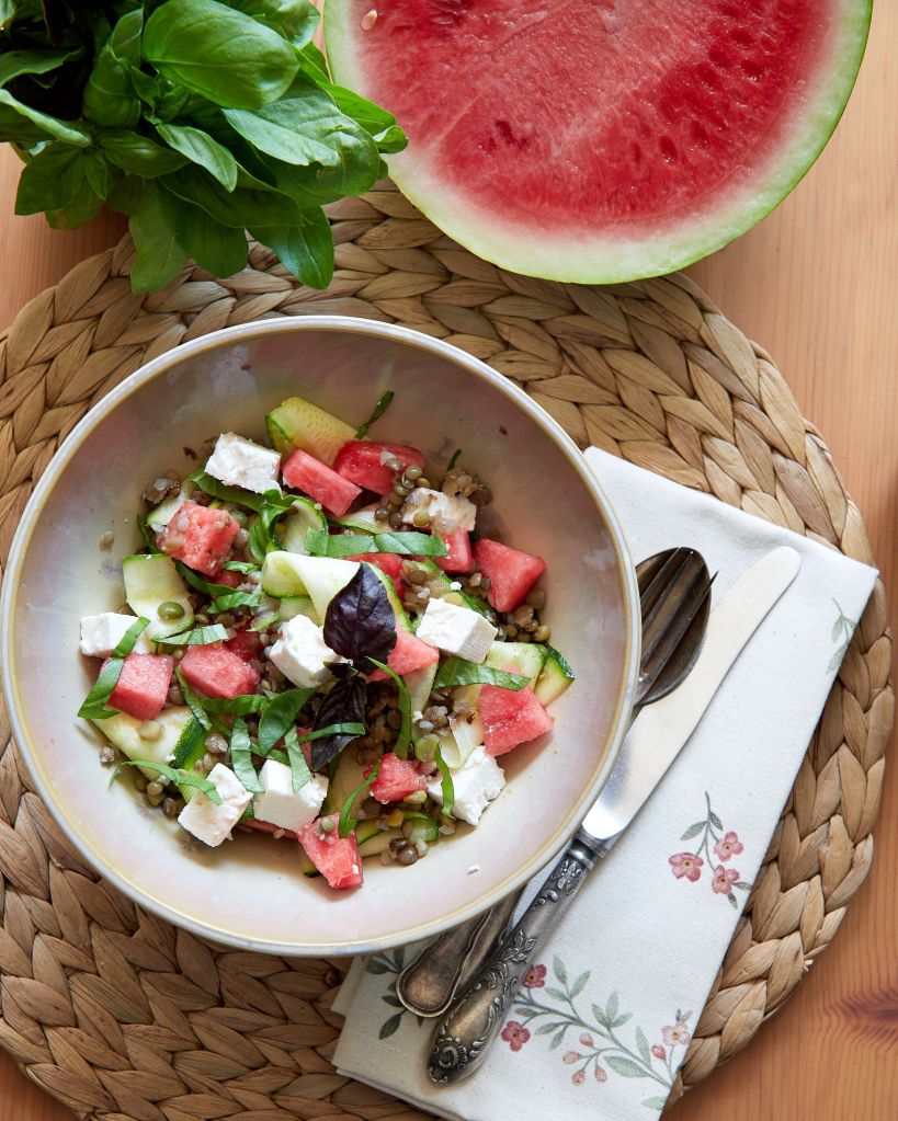 Тази салата е различна. В нея освен диня и сирене имаме леща (моята е микс от сортове плюс фава, боб мунг и елда, но спокойно можете да заложите на един вид) и мариновани тиквички. Знам, че може би ще ви прозвучи странно, но е много свежо и вкусно и се надявам да се престрашите да опитате.