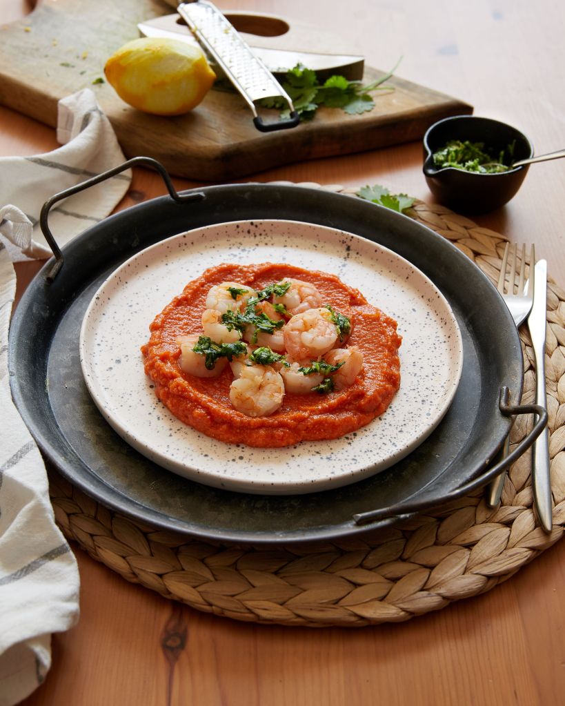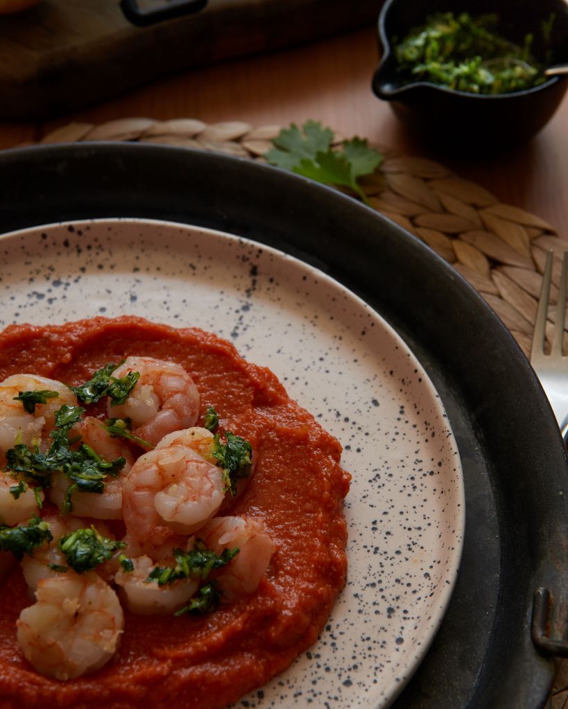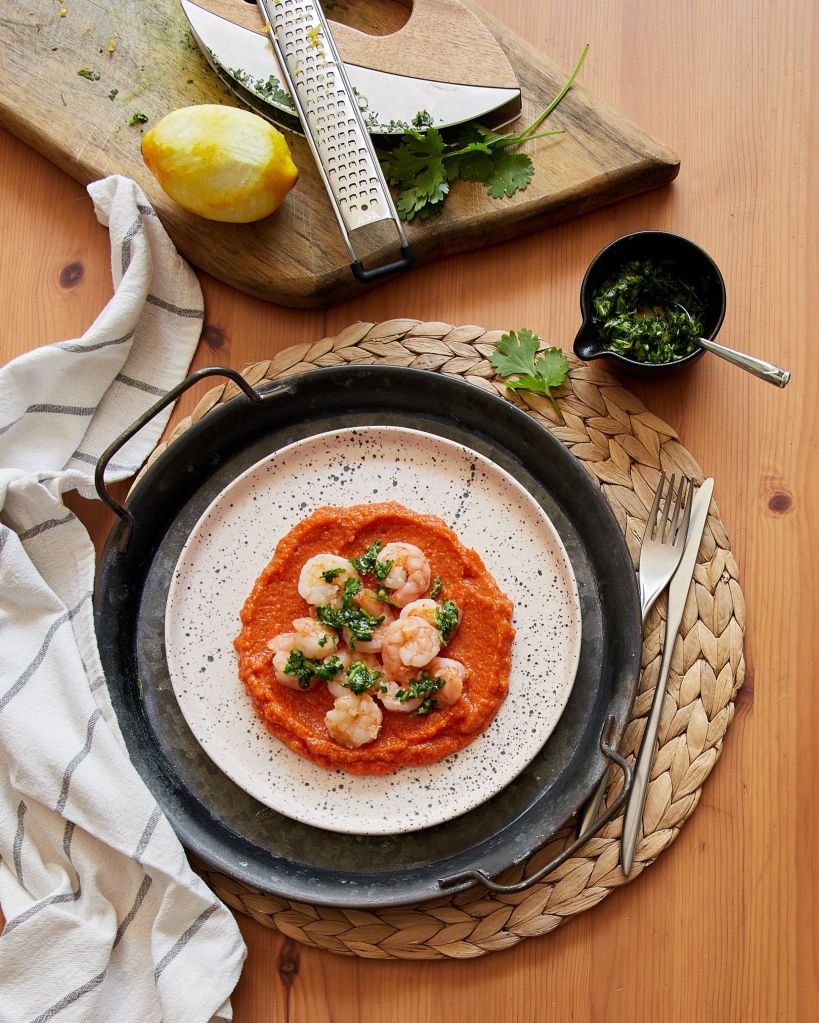 Хумусът с червени чушки е много приятна и вкусна забежка от оригиналната рецепта. аз дори пропуснах сусамовия тахан. Изпекох чушките, заедно с малко шалот и чесън и блендирах със сварен нахут. Подправих с микс Кажун на Спайзинг. Този хумус може да бъде основа на различен протеин – печено месо, гриловано сирене и т.н., но аз му добавих скариди на тиган и гремолата с кориандър, вместо магданоз. Комбинацита е супер вкусна.