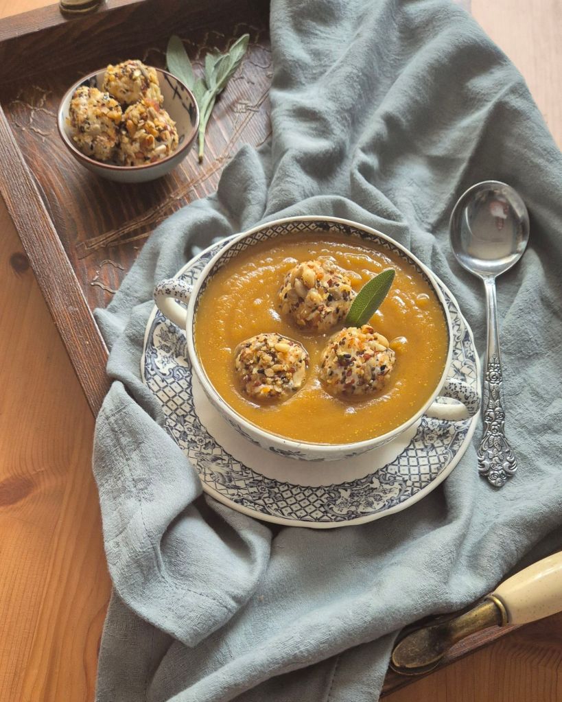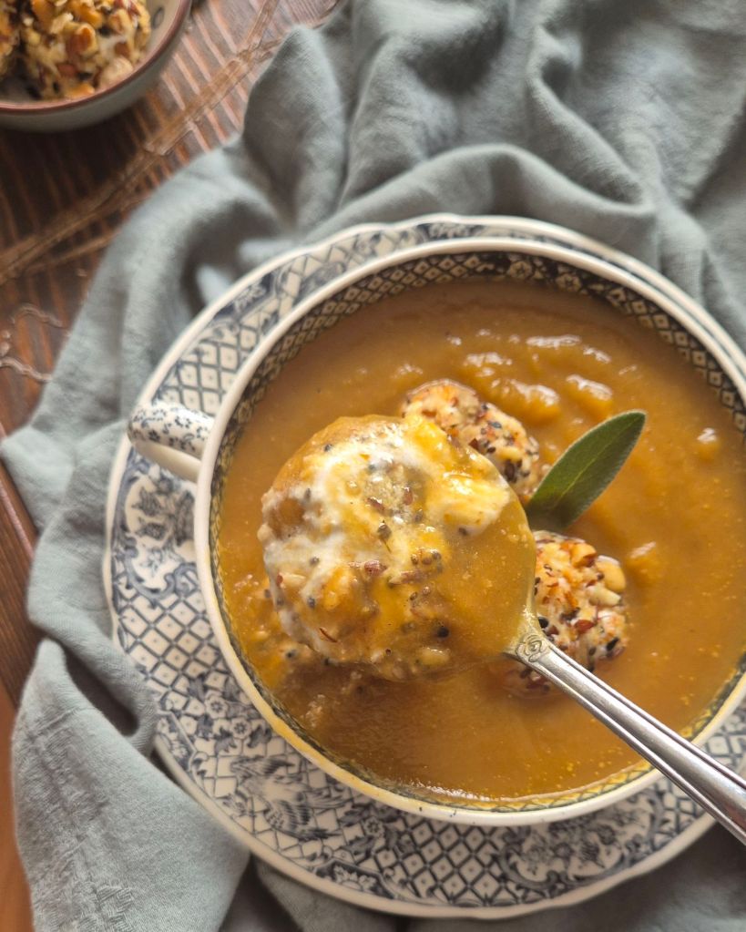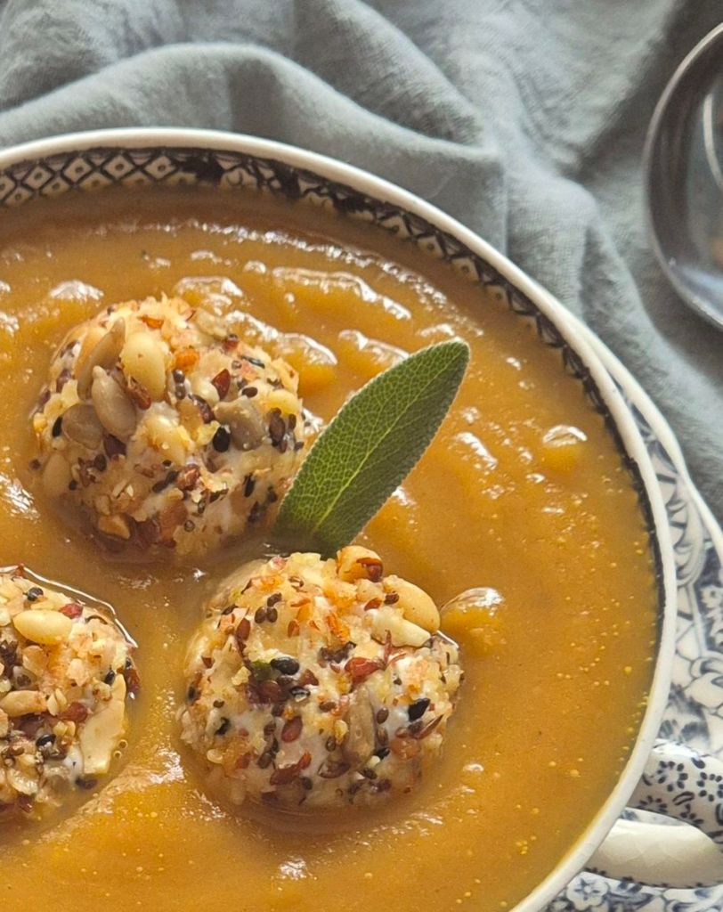 За да балансирам ястието, добавих топчета от сирене, оваляни в една поръска за салати и супи, която преди време видях при Надя Петрова. Протеинът в тях прави общото количество почти 12 г, което е много добре за предястие. Топчетата от сирене са прекрасни не само като добавка към тази супа, но и като самостоятелен снак.