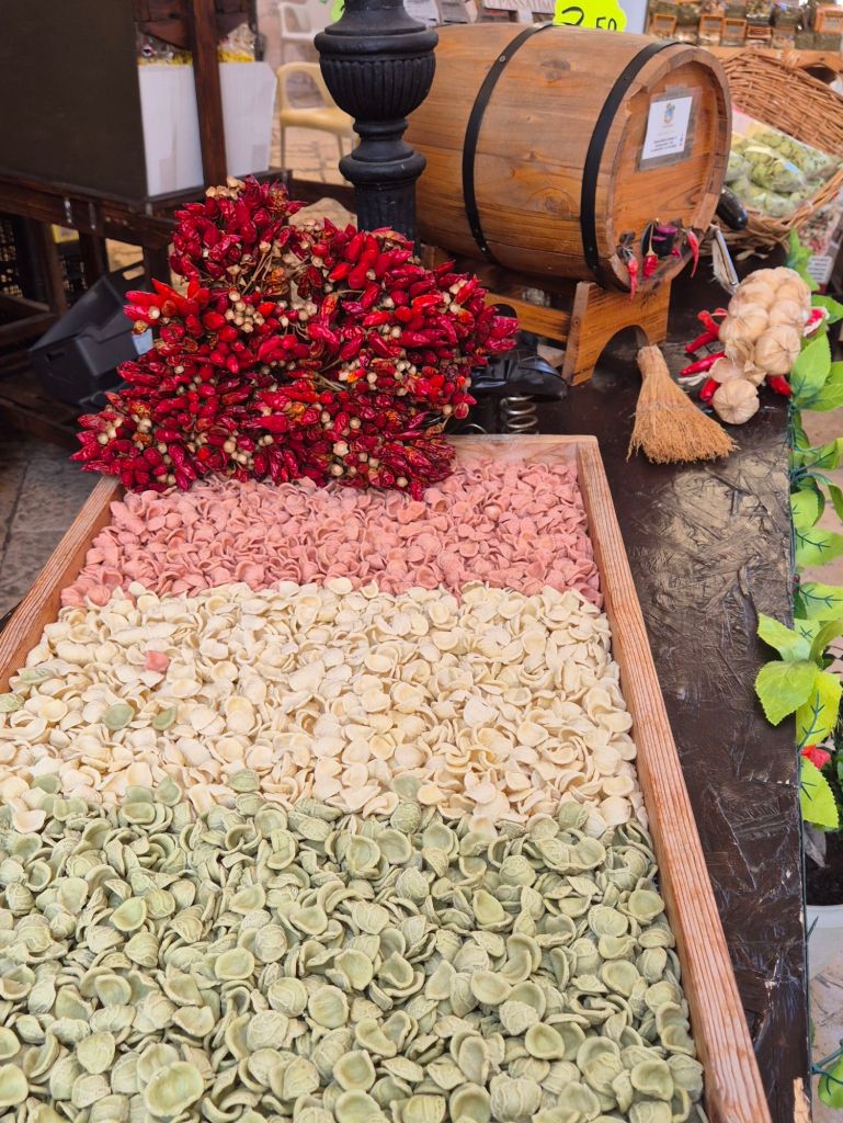Orecchiette са традиционната паста на Пулия. В Бари често ще видите на улиците в стария град жени, които я правят пред очите ви. Ще я намерите сготвена по различен начин в повечето ресторанти. Аз си взех от Матера пакет подобна паста, но оформена като маслинови листа.