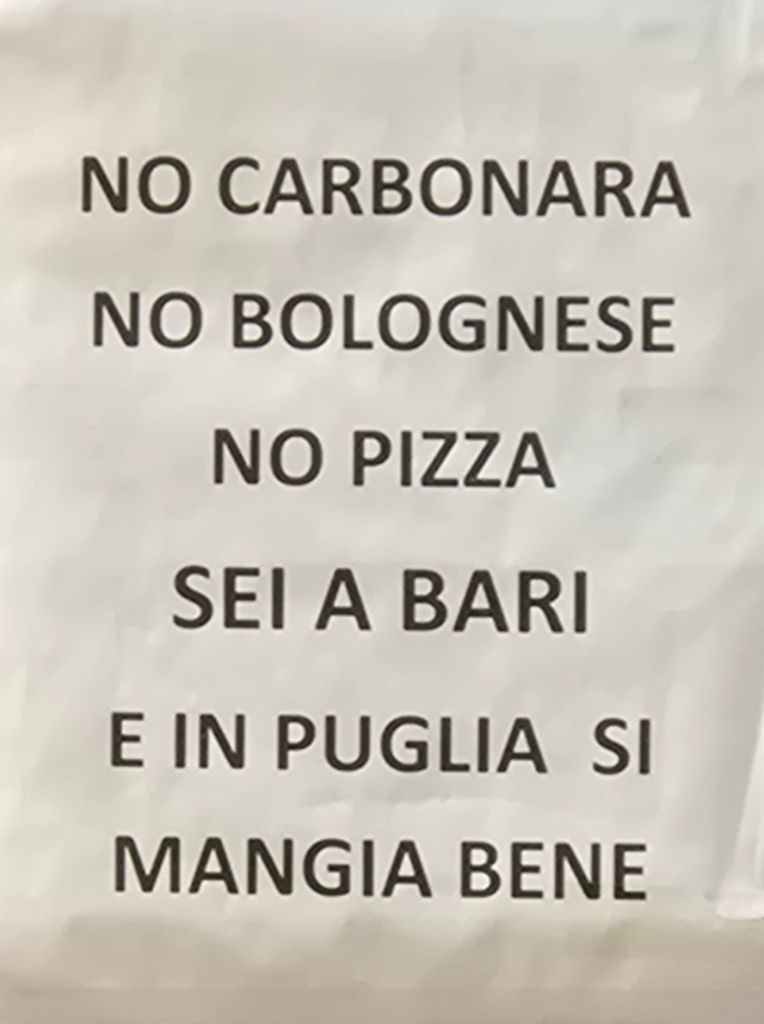 „Няма карбонара. Няма болонезе. Няма пица. В Бари сте и в Пулия се яде добре.“