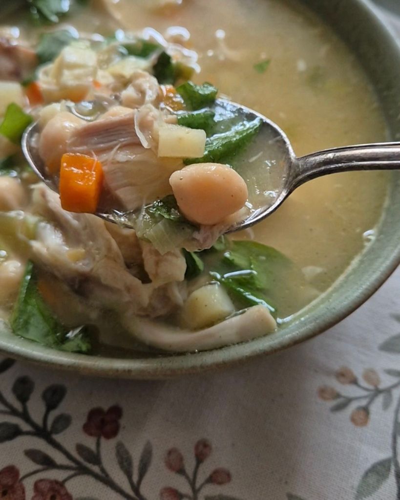 Независимо от рецептата, една хубава пилешка супа винаги започва с хубаво пиле, по възможност пасищно. Моето е от Чифлик Ливади. В тази интерпретация пилето е съчетано с моркови, пащърнак, праз и нахут. Първо сварявам пилето, след което отделям месото от костите и кожата. В получения богат ароматен бульон сварявам останалите продукти и преди да добавя накъсаното месо, отделям няколко черпака, които пасирам и връщам в супата. Така бульонът става естествено по-гъст без застройка.