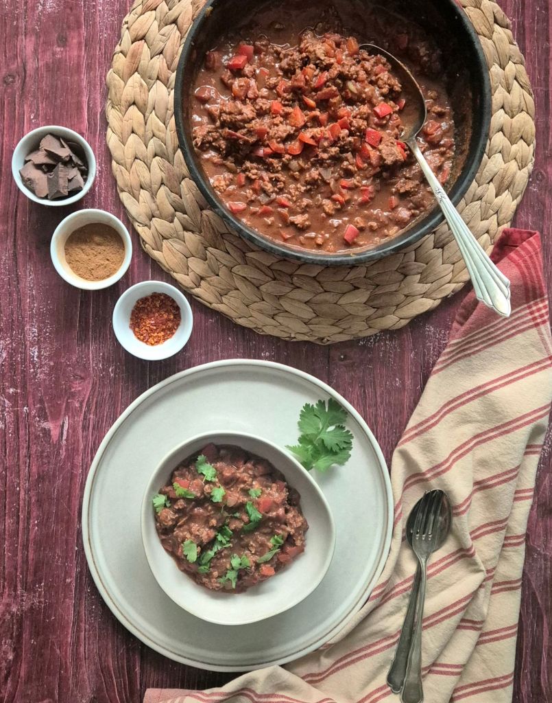Загрейте зехтина в тенджера на средна степен и добавете лука и чесъна. Гответе 3 – 4 минути. Добавете чушките и гответе още 3 – 4 минути. Добавете мляното месо, разбъркайте добре, за да не се образуват бучки и гответе, докато промени цвета си – около 10 минути. Добавете доматите, изчакайте да заври, намалете до къкрене и гответе още 10 минути. Добавете подправките и какаовата маса, разбъркайте добре и свалете от котлона. Поднесете с пресен кориандър.