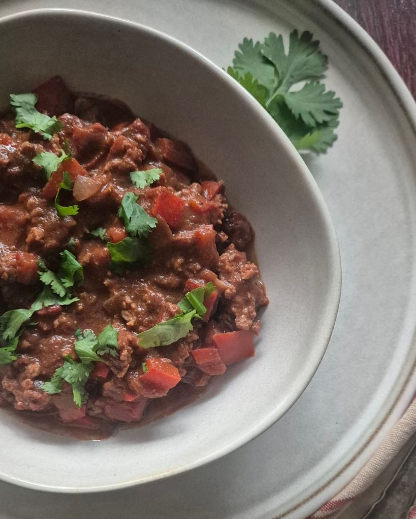 Боб и царевица няма, защото трябваше да е нисковъглехидратно, но има две нестандартни добавки. Използвах пуешко, което може да се замени с говеждо или пилешко. Подправих с кимион и… pumpkin spice. Да, точно тази която обикновено се ползва за десерти. Попаднах на идеята случайно и се оказа много сполучлива.