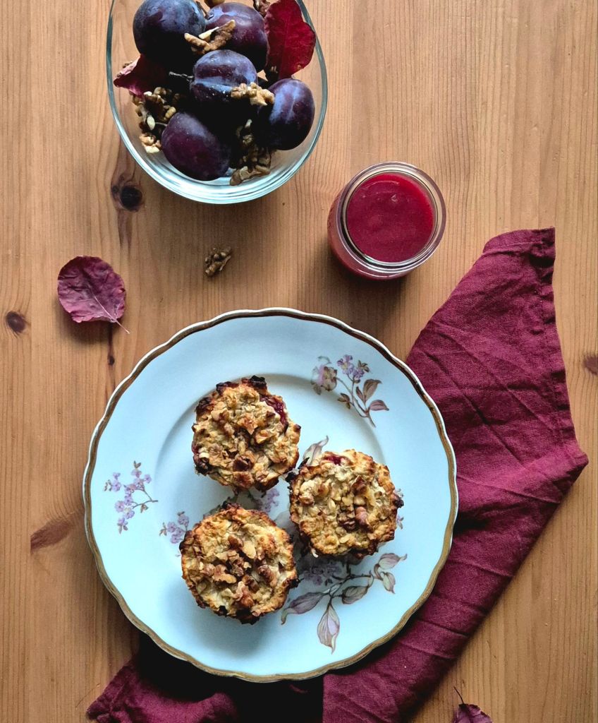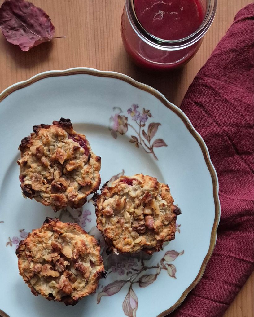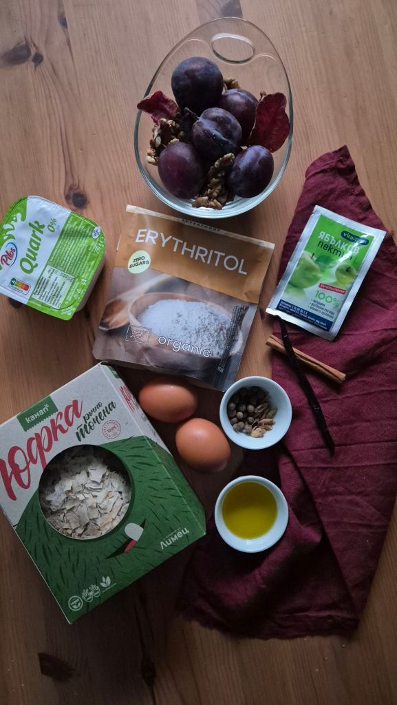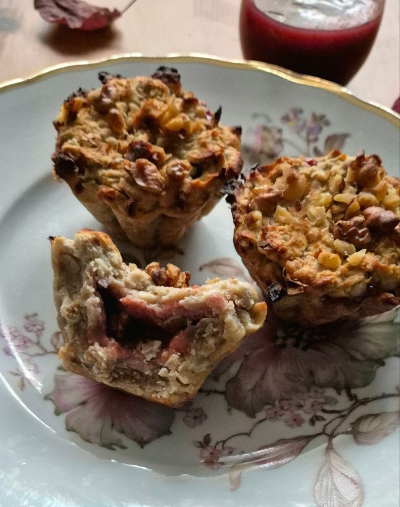 Другата пратка беше от Канап. Този път нямаше юфка, но аз имах един пакет от миналия месец и реших да използвам него. Направих гъсто „тесто“ с яйца, кварк и зехтин, подсладено с еритритол. Оформих чашки във формите за мъфини и напълних с мармалад от сливи и орехи. Покрих с „капачета“ от тестото и изпекох до златисто. Понеже ги правих вечерта и нямах време да изчакам да изстинат достатъчно, така и не ги опитах топли. Подозирам, че са били УАУ, защото и на следващата сутрин бяха ужасно вкусни.