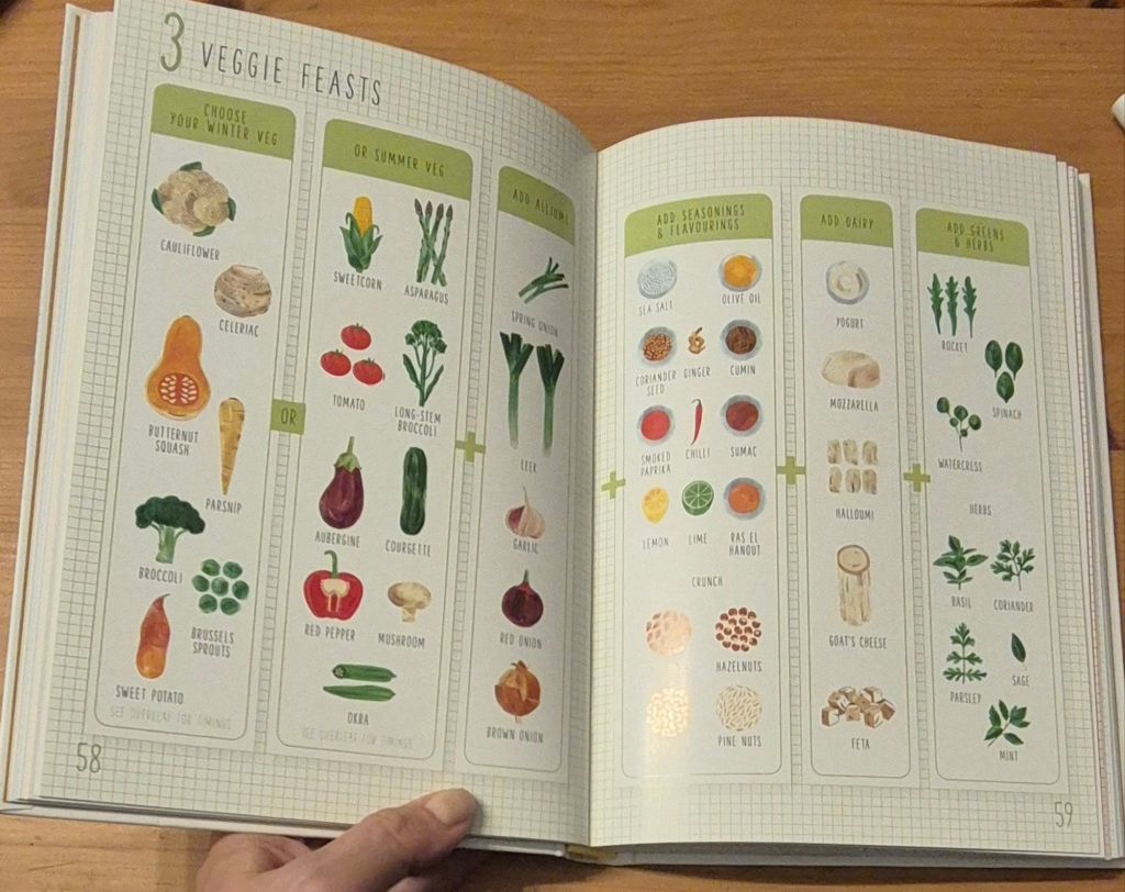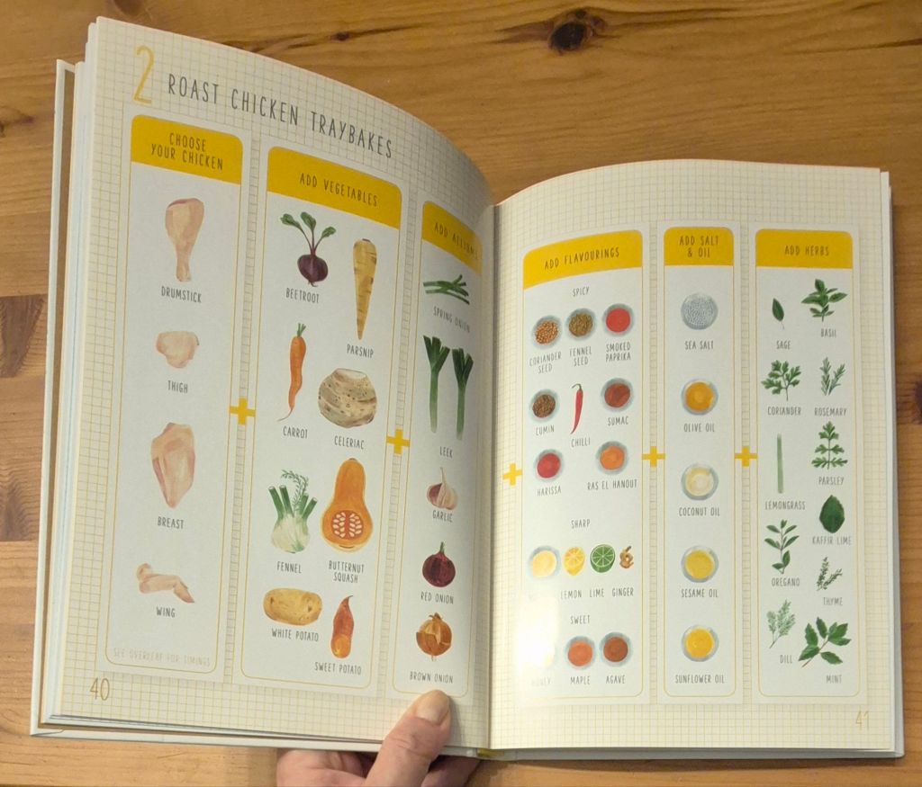 Съвсем наскоро открих книгата „The roasting tin“ на Рукмини Айер в книжарница Махала и се влюбих от пръв поглед. Това не е готварска книга с рецепти, които се очаква да се спазват с точност (което поне на мен хич не ми се отдава), а по-скоро ръководство за това как да си сглобите ястие, което се готви в един съд (тава за печене) и е изцяло по ваш вкус. Има и примерни рецепти, разбира се, но авторката насърчава личното творчество, така да се каже. В книгата има схеми и времена за печене на различните продукти, така че да можете да си приготвите уникално ваше ястие.