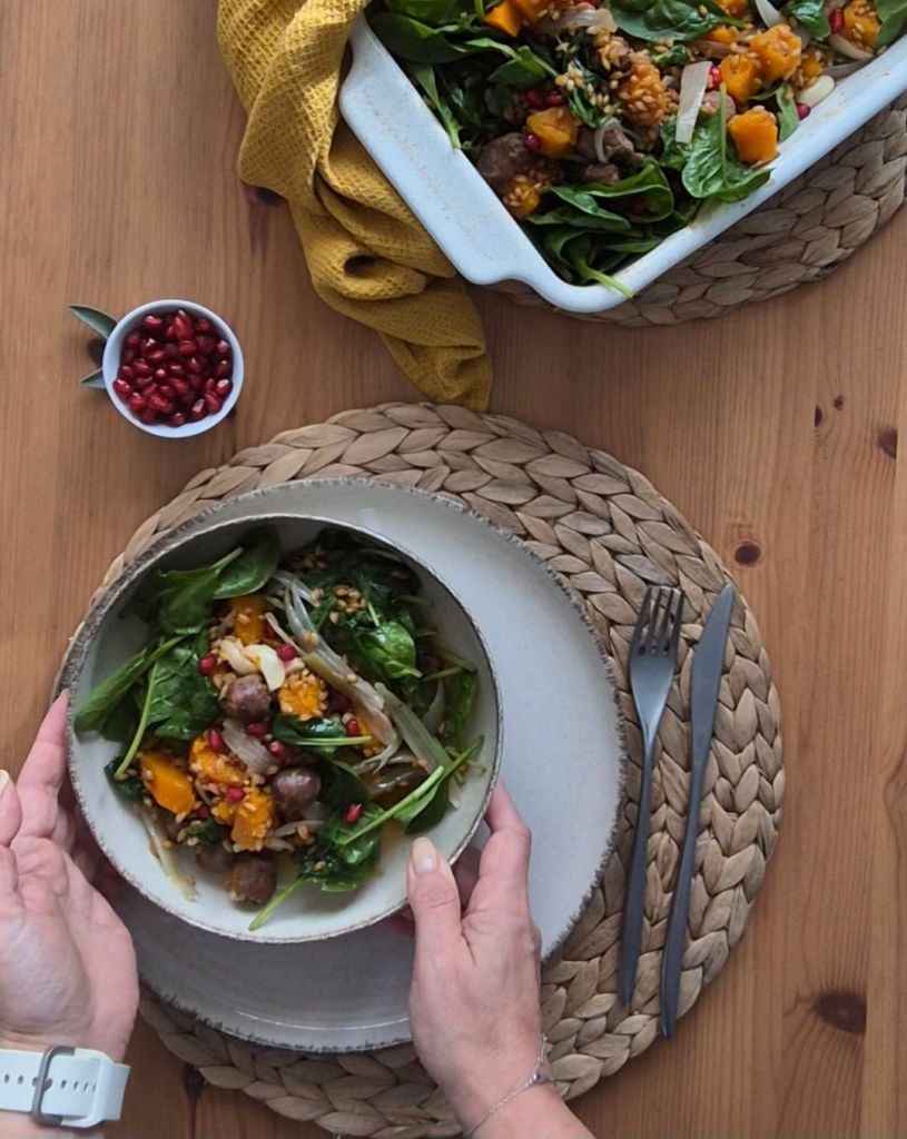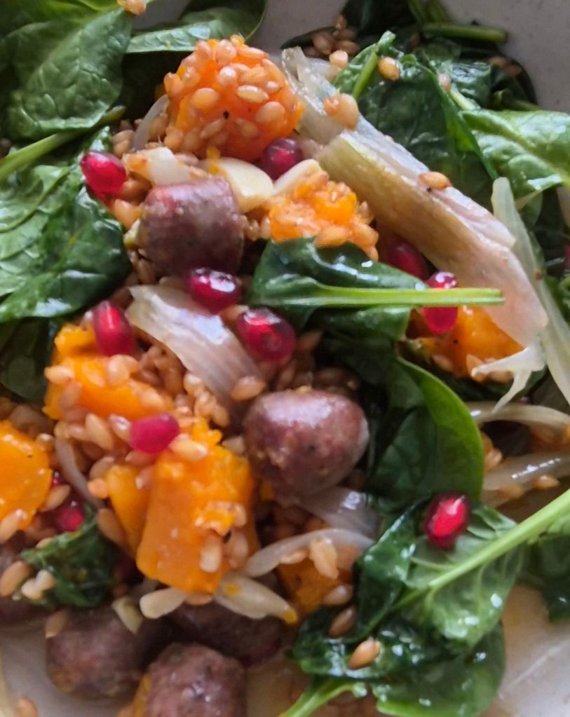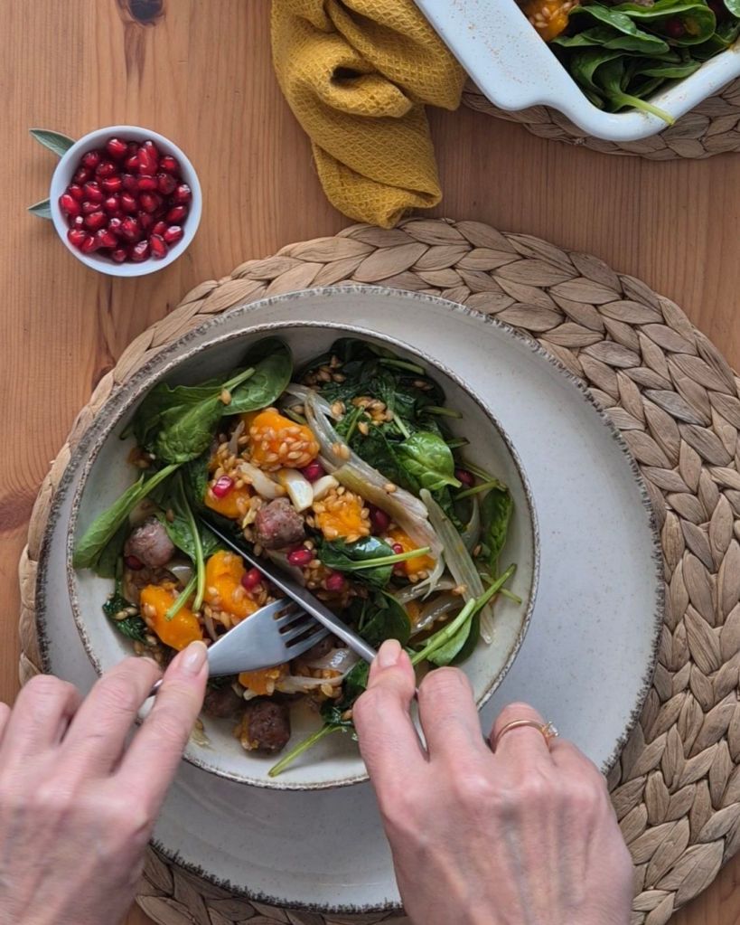 Леката сладост на тиквата, текстурата на лимеца, свежестта на спанака и приятната киселинност на нара съчетани в едно превръщат това ястие в пиршество за небцето и за очите. Ако наденицата ви притеснява, заменете с късчета месо по избор. Запазете си тази рецепта – по-хладното и дъждовно време последните дни е чудесен повод да се поглезите с нещо интересно и нетрадиционно.