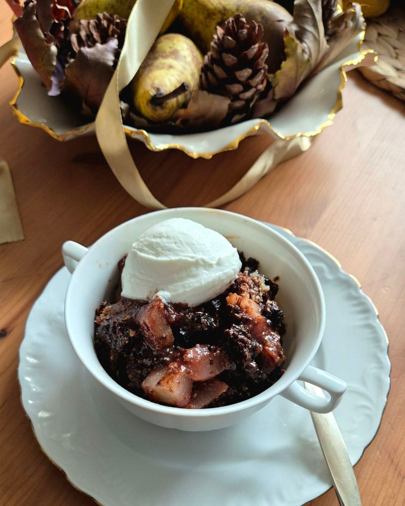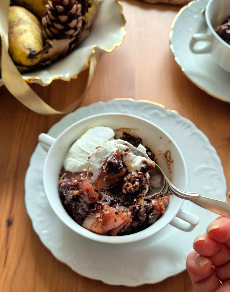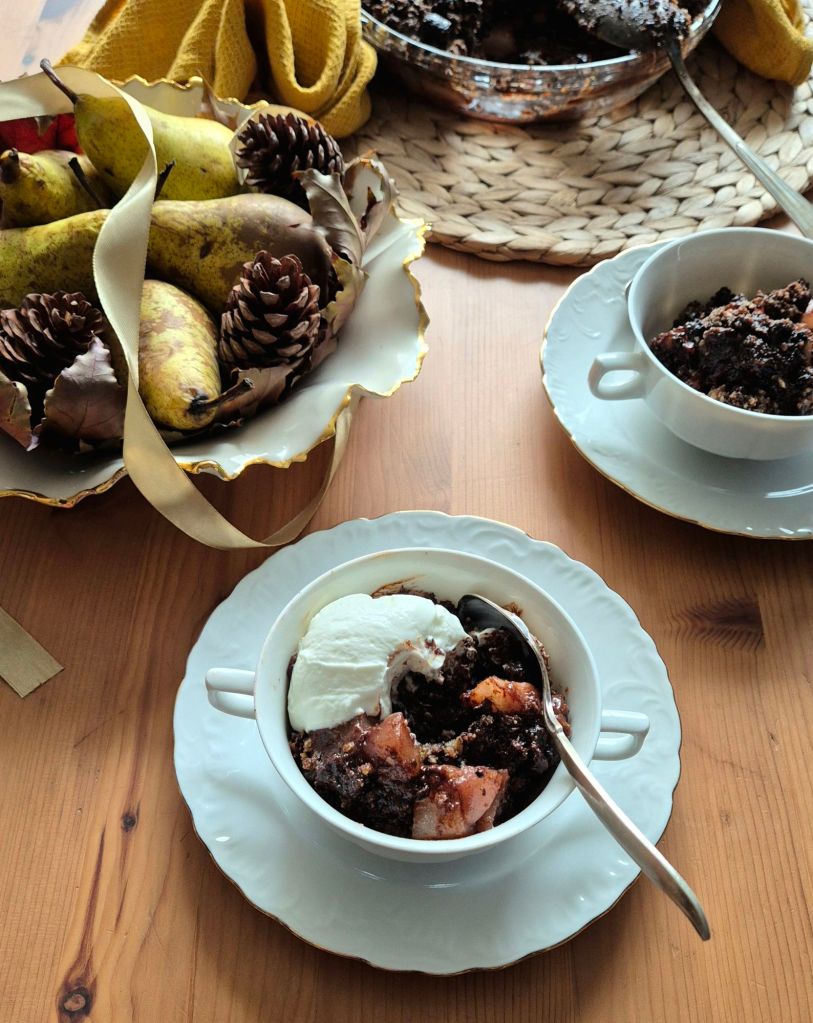 Исках да е с круши, понеже имах няколко прекрасни екземпляра, но също така да е различен. Така към рецептата се присъедини аронията, накисната в Марсала, за да се хидратира и овкуси. За самия кръмбъл беше ясно, че ще е безглутенов с бадемово брашно (за намаляване на въглехидратите) и малко овесени ядки (за текстура). Дотук добре, но круши и шоколад е толкова хубава комбинация, че ми се искаше някак и тя да присъства.