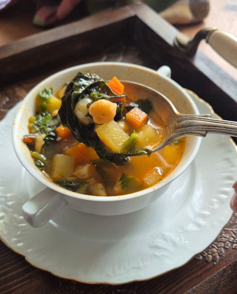 В днешната рецепта имаме лук и чесън, моркови, целина, картофи и нахут. Манголд и листата на целината добавят не само ярко зелен цвят, но и свежест. Използвах говежди костен бульон и добавих една кора от пармезан по време на готвенето – тя овкусява допълнително и леко сгъстява супата.