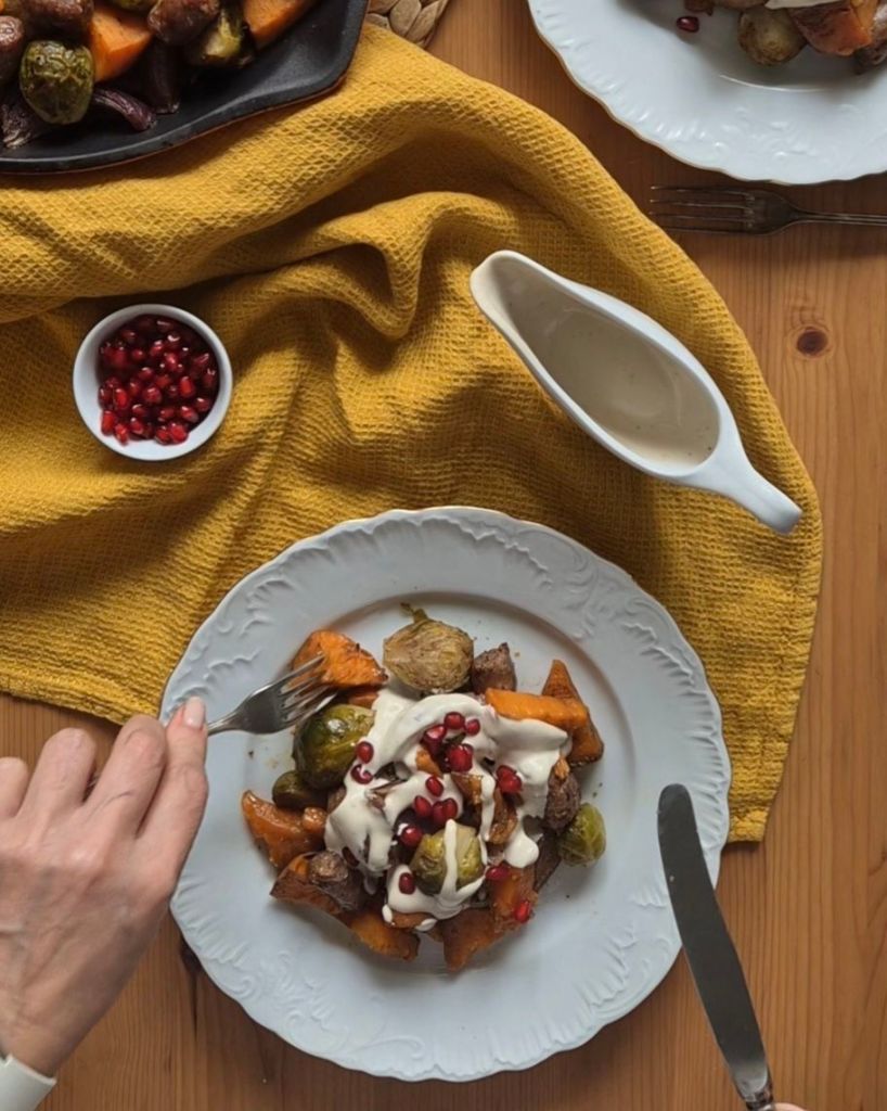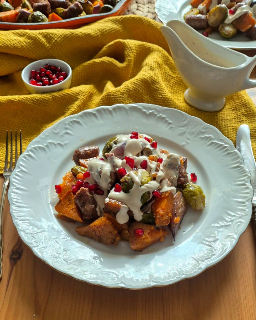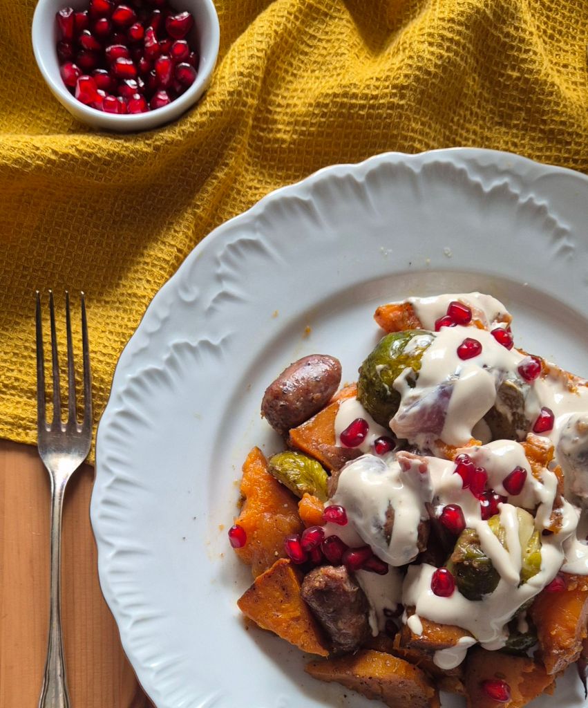 Още една рецепта, приготвена на фурна, по възможно най-лесния начин. Брюкселското зеле ми е сред любимите сезонни зеленчуци. Знам, че много хора не го харесват, но според мен те просто не са опитвали наистина добра рецепта с него. Тук го съчетах със сладки картофи, червен лук и хубави говежди наденички и подправих с една от любимите ми смеси – бахарат от Спайзинг.