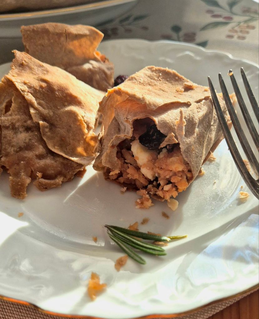 Настъргах ги на най-ситното ренде (с кухненски робот) и ги сготвих с клонче розмарин. Подсладих умерено, защото търсех балансиран сладко-солен вкус. Добавих боровинки, козе сирене и орехи и завих в ръчно-точените кори на Канап. Намазах с препечено масло, овкусено с розмарин и изпекох до приятен загар. Баницата е чудесна както топла, така и студена.