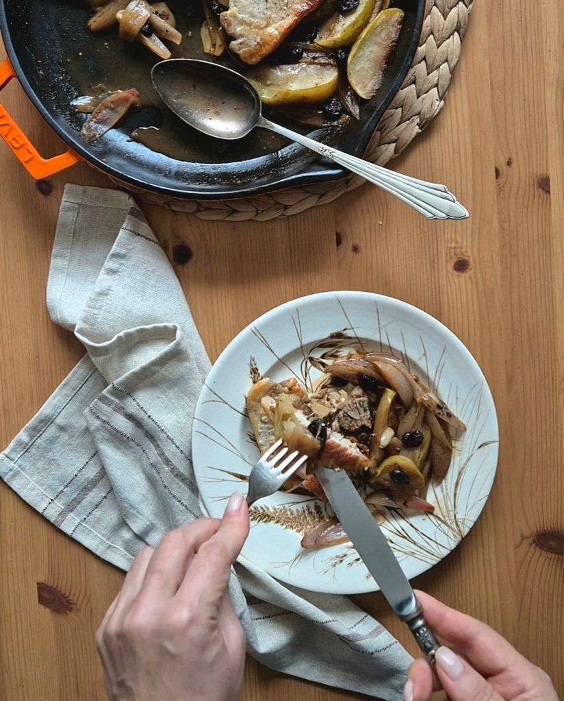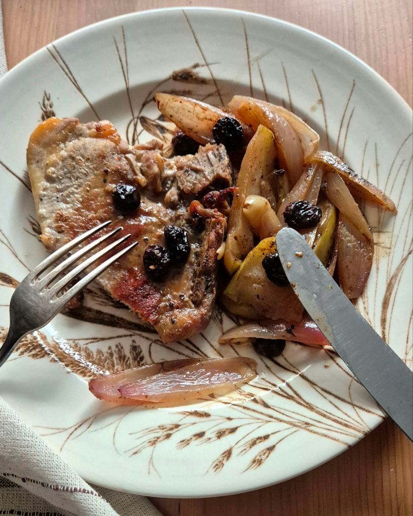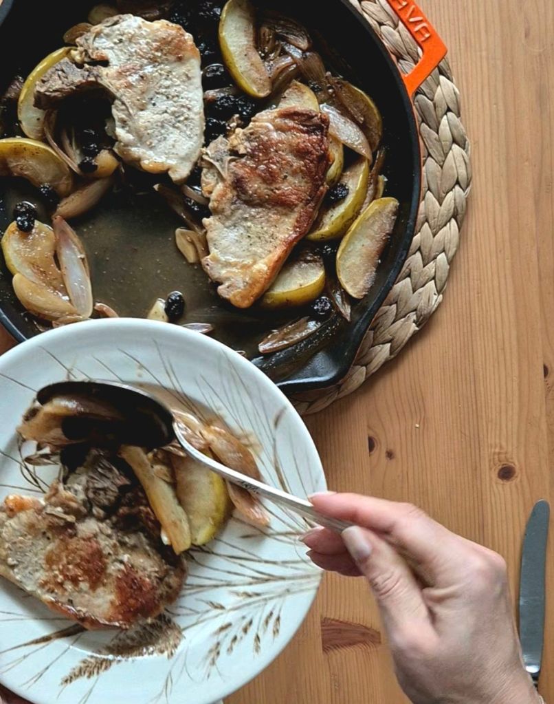 Едно от нещата, които харесвам, е, че това месо много добре се комбинира с плодове. Правила съм свинско с праскови, а днешната е рецепта с ябълки и боровинки и е наистина прекрасна. Приготвянето започва на тиган и завършва във фурната и отнема общо около 40 минути, така че ще ви спести време в и без това натоварените дни.