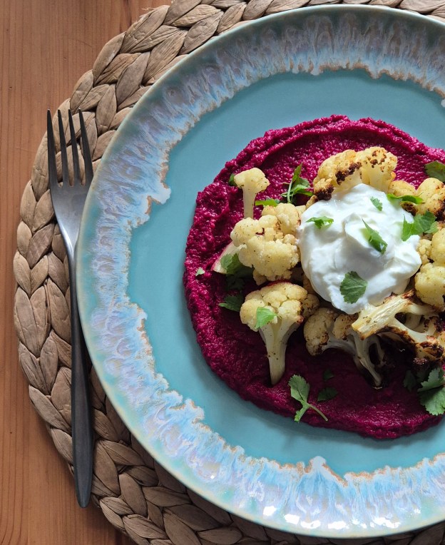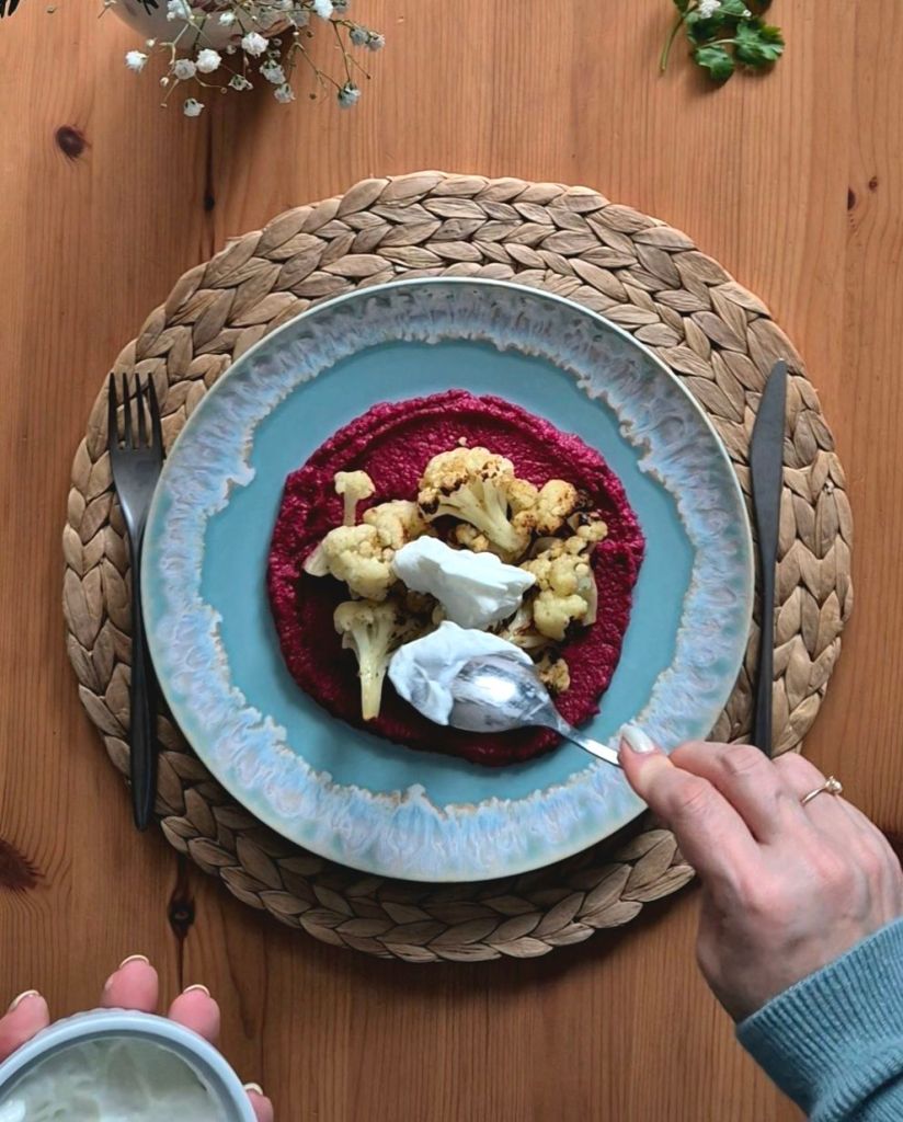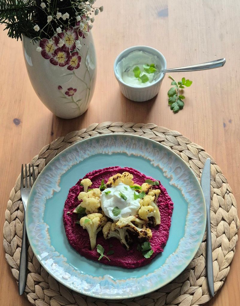 Карфиола овкусих и изпекох на розички в air fryer, а от боба и цвеклото направих един чудесен хумус. Сервирах със скир и пресен кориандър. Ястието е едновременно много вкусно и красиво. Ако обичате зеленчуци, със сигурност ще ви хареса.