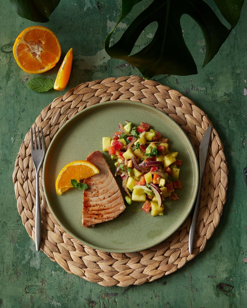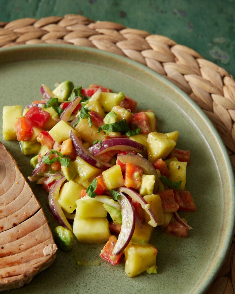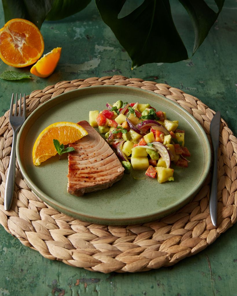 За салатата смесих нарязани на кубчета зелено манго, авокадо и червена чушка, към които добавих малко червен лук. Дресингът е с портокалов сок, мед и зехтин и завърших с прясна мента. Сервирах със стек от риба тон на тиган, подправен със сол, черен пипер и малко портокалов сок. Бързо, лесно и много вкусно ястие, с което можете да блеснете, когато разполагате със силно ограничено време.
