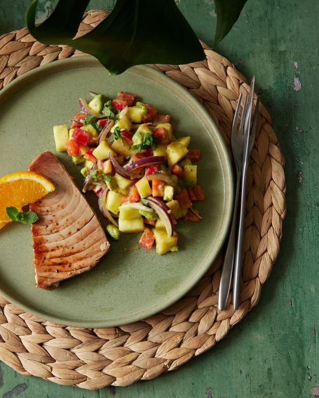 За салатата смесих нарязани на кубчета зелено манго, авокадо и червена чушка, към които добавих малко червен лук. Дресингът е с портокалов сок, мед и зехтин и завърших с прясна мента. Сервирах със стек от риба тон на тиган, подправен със сол, черен пипер и малко портокалов сок. Бързо, лесно и много вкусно ястие, с което можете да блеснете, когато разполагате със силно ограничено време.