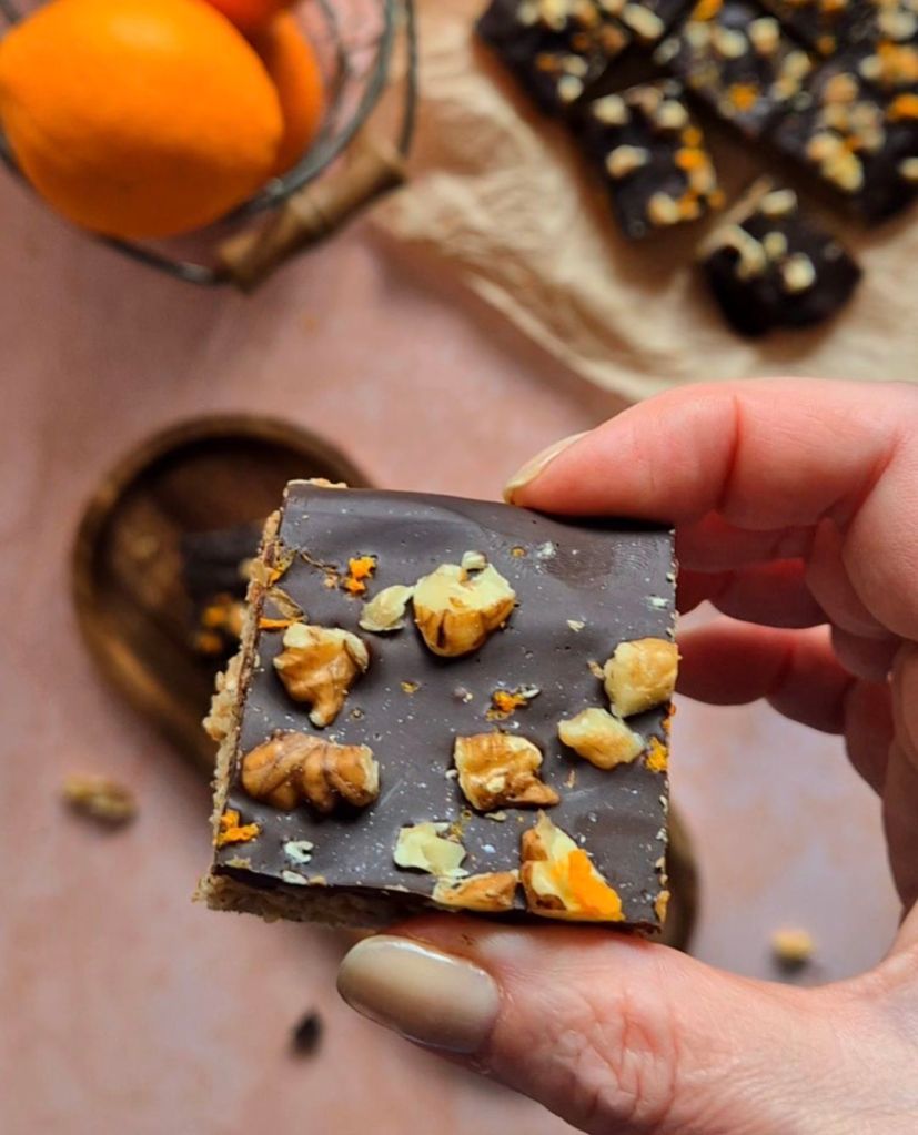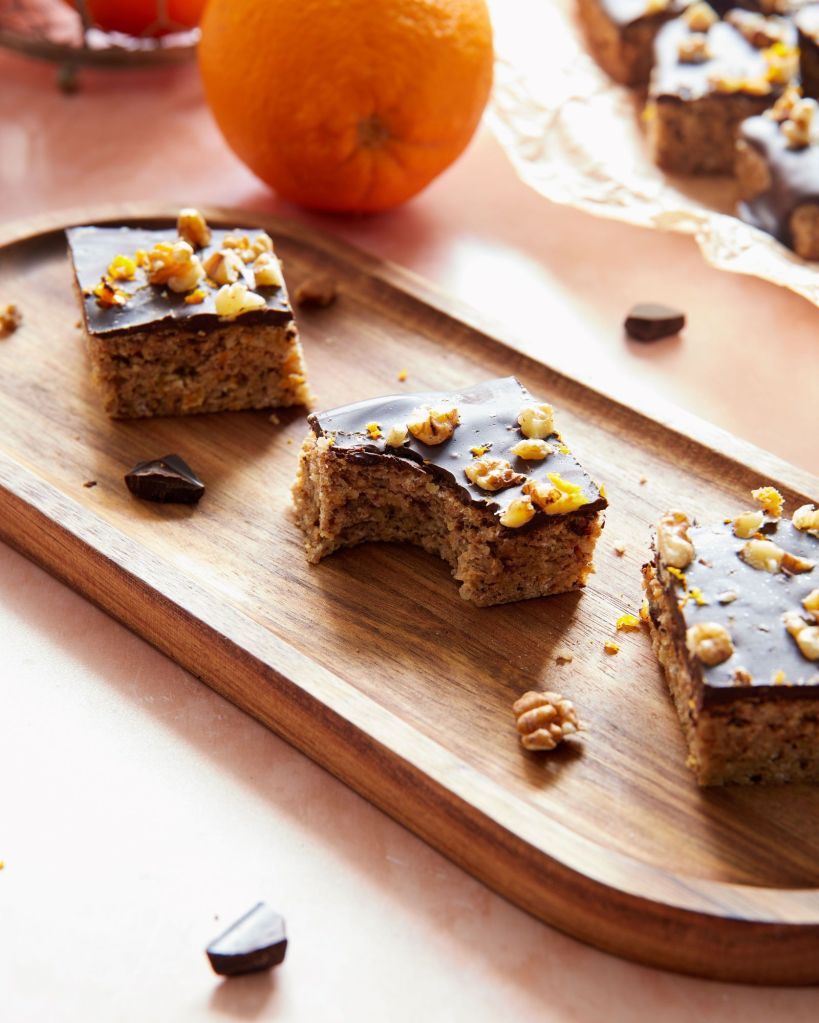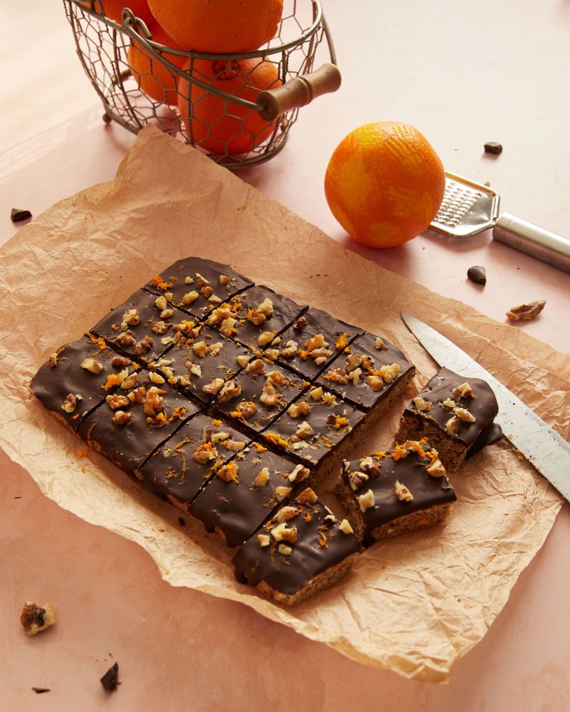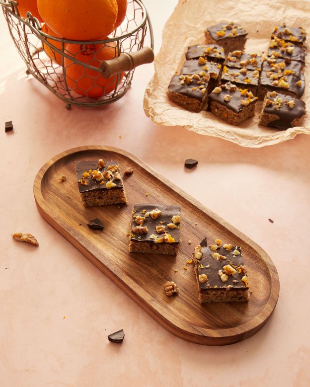 Изчакайте да изстине и през това време разтопете шоколада на водна баня със зехтина. Покрийте с шоколада и поръсете с нарязаните ядки и още малко настъргана портокалова кора. Приберете в хладилника, за да стегне шоколадът и след това нарежете.