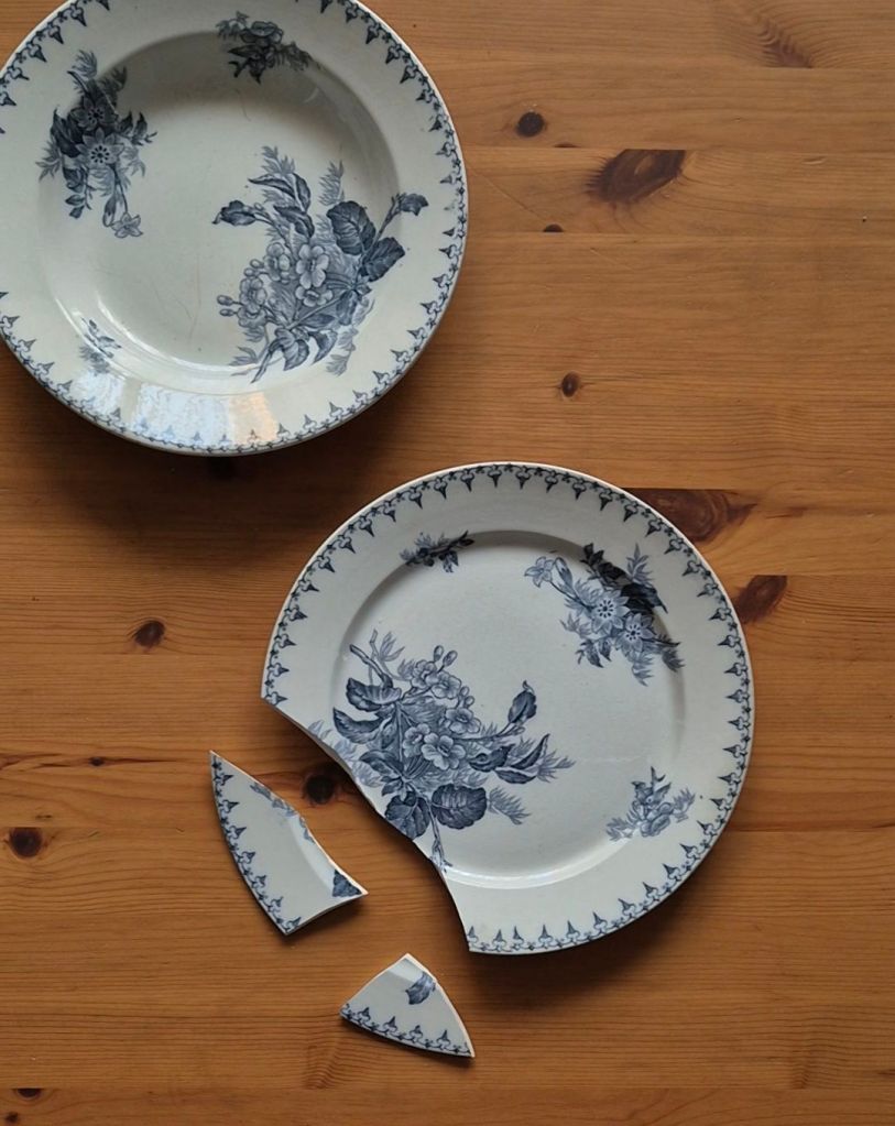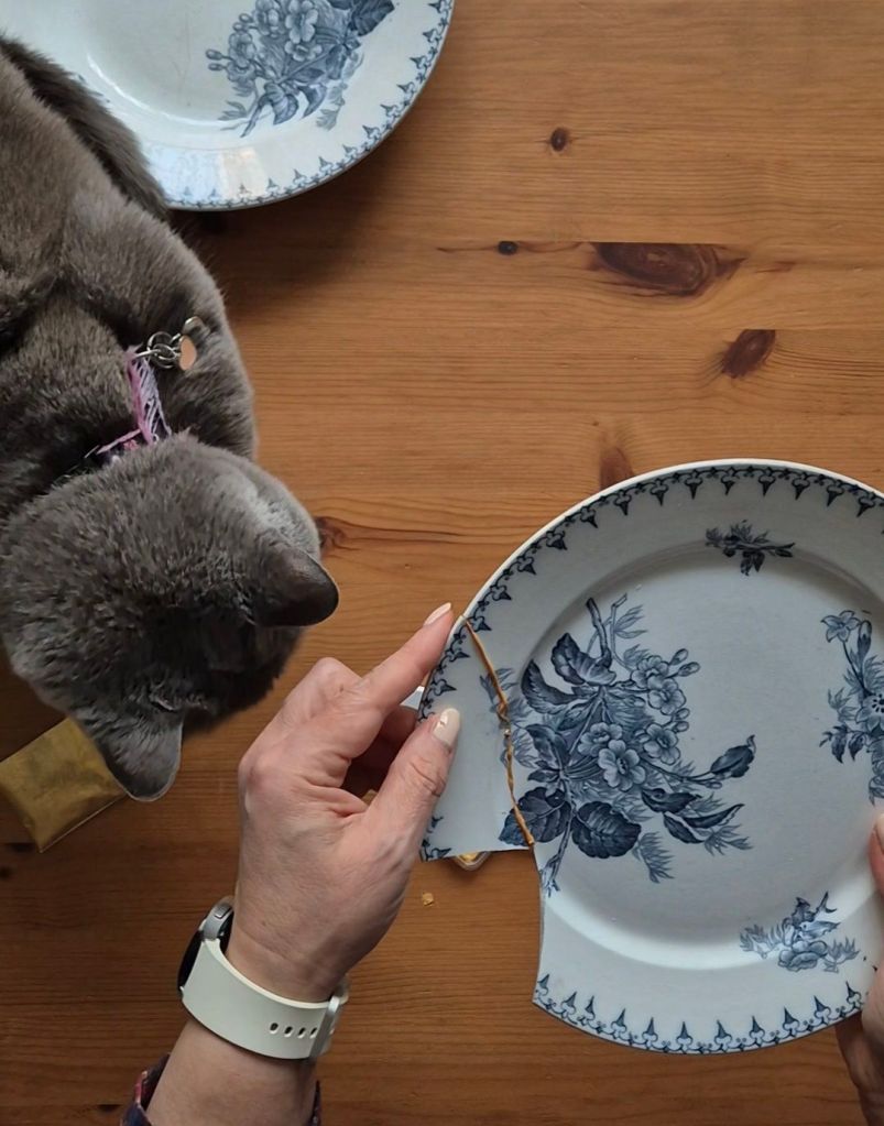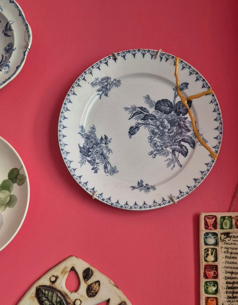 Пипкава и лепкава работа, но идеална за такива като мен 🤭. Моето кинцуги няма да спечели награда за красота и прецизност, но ми е първото такова и заслужава място на стената в кухнята, откъдето да ми напомня всеки ден, че следите на времето, които носим по себе си, не са задължително недостатък.