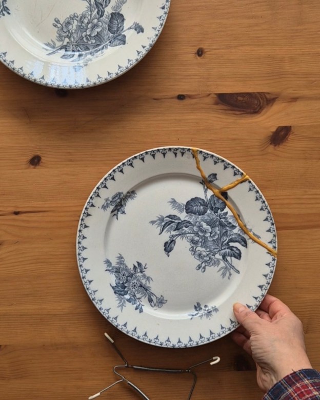 Пипкава и лепкава работа, но идеална за такива като мен 🤭. Моето кинцуги няма да спечели награда за красота и прецизност, но ми е първото такова и заслужава място на стената в кухнята, откъдето да ми напомня всеки ден, че следите на времето, които носим по себе си, не са задължително недостатък.