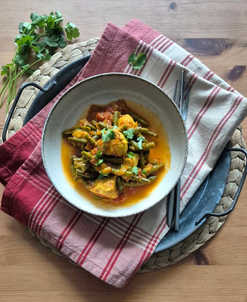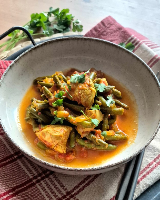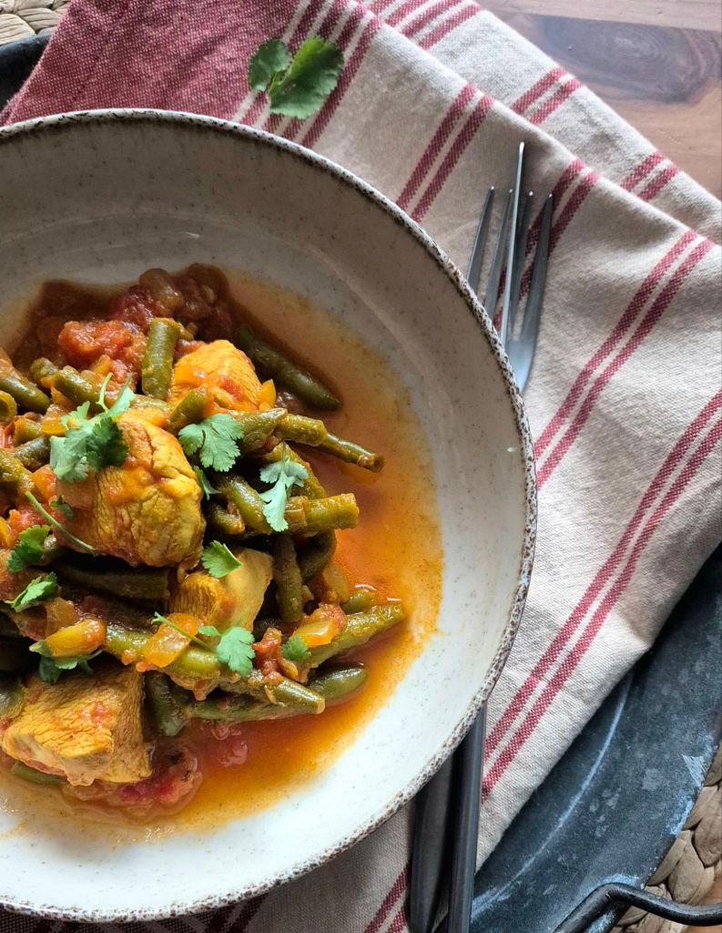 Това е първото ястие, което приготвих след последното пътуване. То не е истинско къри, но напомня на такова, защото е подправено с кимион, джинджифил и куркума. Протеинът е от пилешки гърди, фибрите – от френски боб. Много вкусна и много бърза рецепта, която можете да приготвите за около 30 минути и която е идеална за през седмицата, понеже изисква минимални усилия, а дава максимален резултат.
