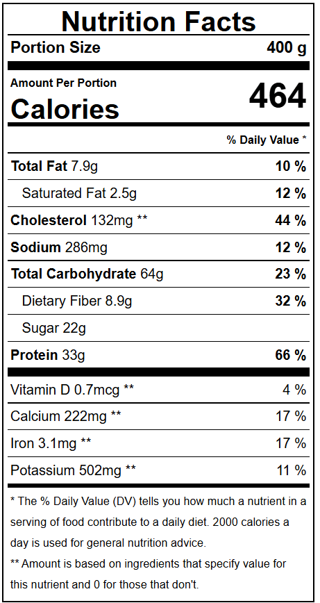 В крайния си вариант, със соса ястието има 33 г протеин и 9 г фибри и е чудесна опция за обяд или вечеря в дните, в които искате да изключите месото.