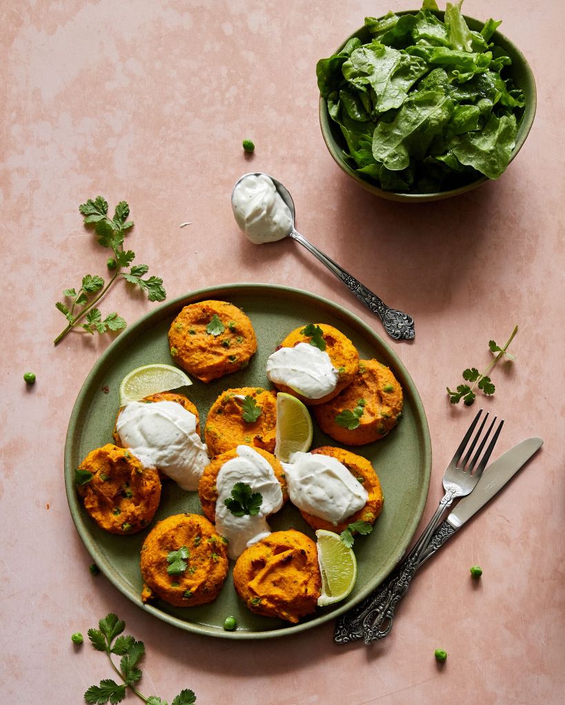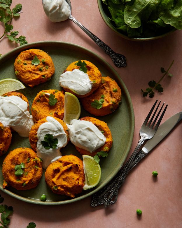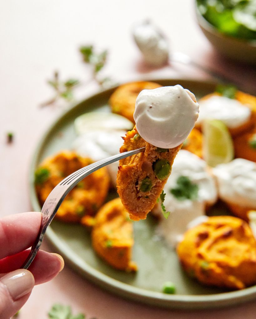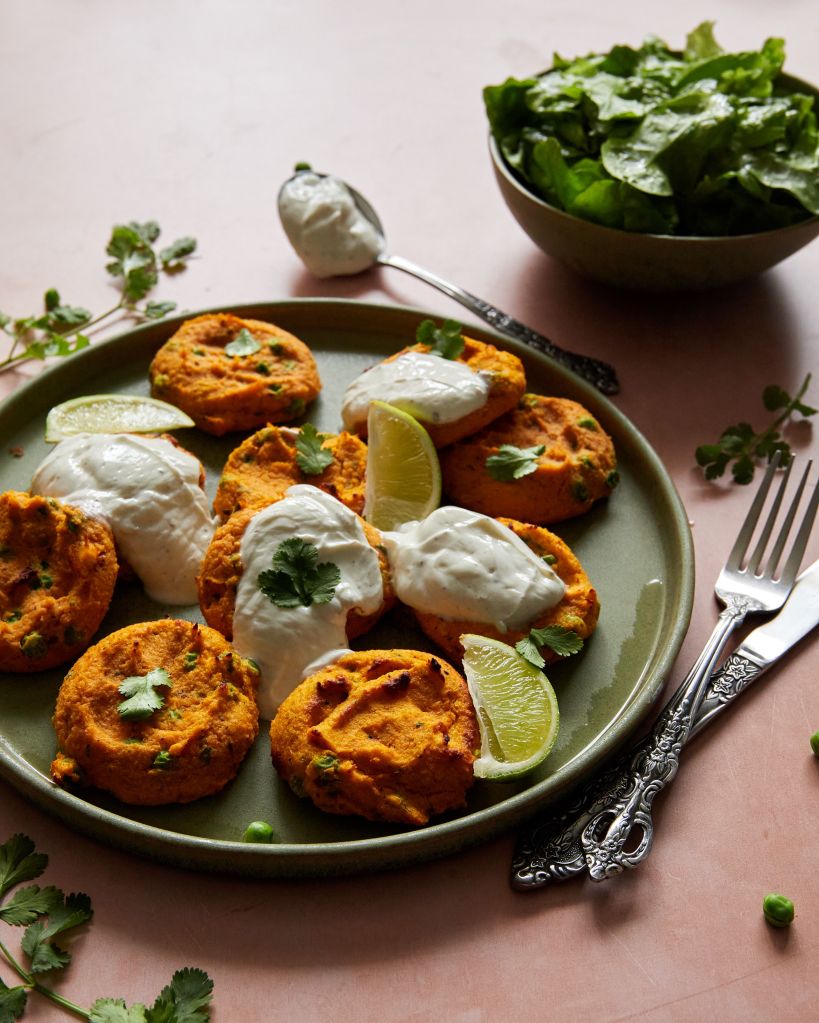 Имах един сладък картоф и му търсех някакво нестандартно приложение. Така открих, че в Индия има ястие tikki, което се води улична храна и представлява нещо като кюфтенца от сладък картоф и грах, подправени с масала и пресен кориандър. Оригиналът е веган, но аз държах да има достатъчно протеин и затова добавих яйца и скир.