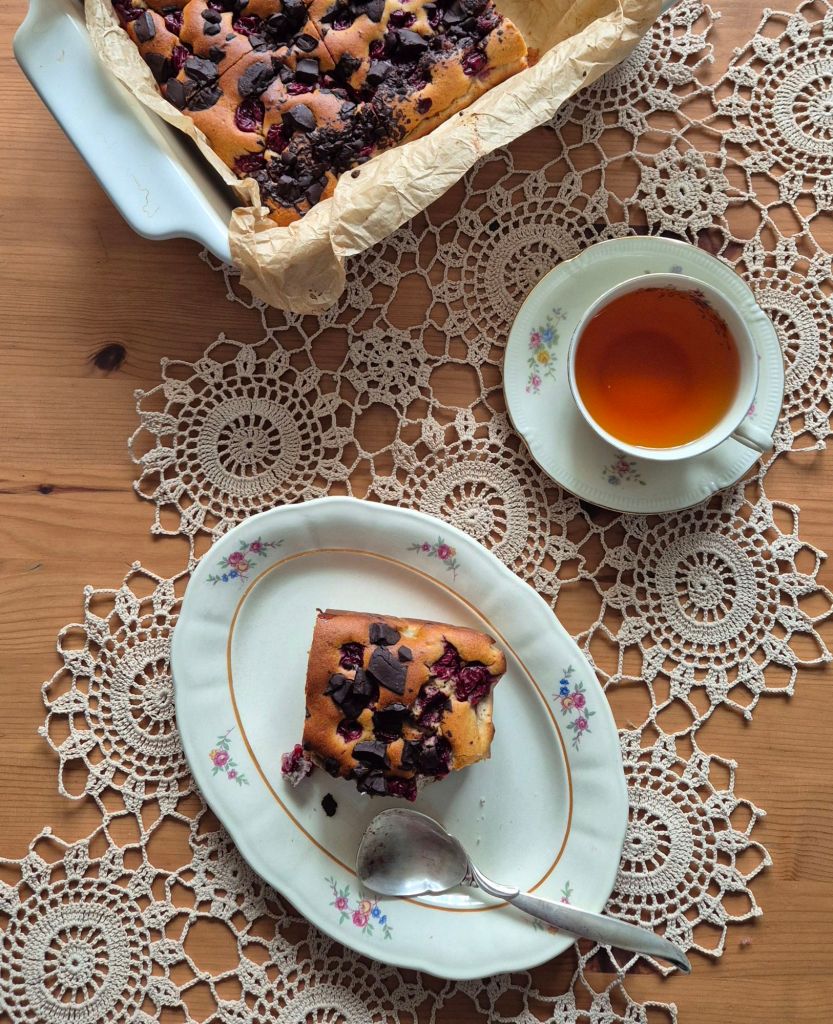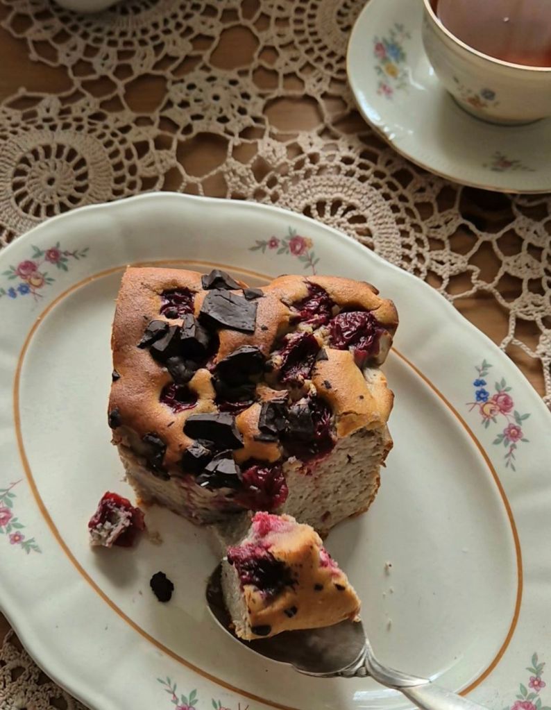 Загрейте фурната до 200 градуса и пригответе тавичка с размери 24 х 17 см, покрита с хартия за печене. Сложете всички продукти (без вишните и шоколада) в блендер и обработете до получаване на гладка смес. Прехвърлете в тавичката и добавете вишните и нарязания шоколад. Печете 50 – 55 минути и оставете да изстине напълно преди да нарежете.