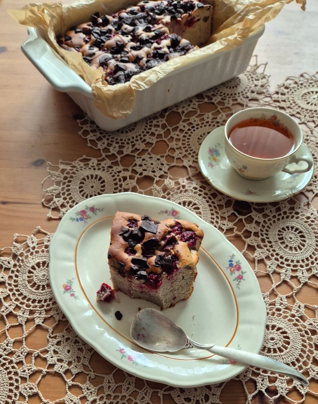 Загрейте фурната до 200 градуса и пригответе тавичка с размери 24 х 17 см, покрита с хартия за печене. Сложете всички продукти (без вишните и шоколада) в блендер и обработете до получаване на гладка смес. Прехвърлете в тавичката и добавете вишните и нарязания шоколад. Печете 50 – 55 минути и оставете да изстине напълно преди да нарежете.