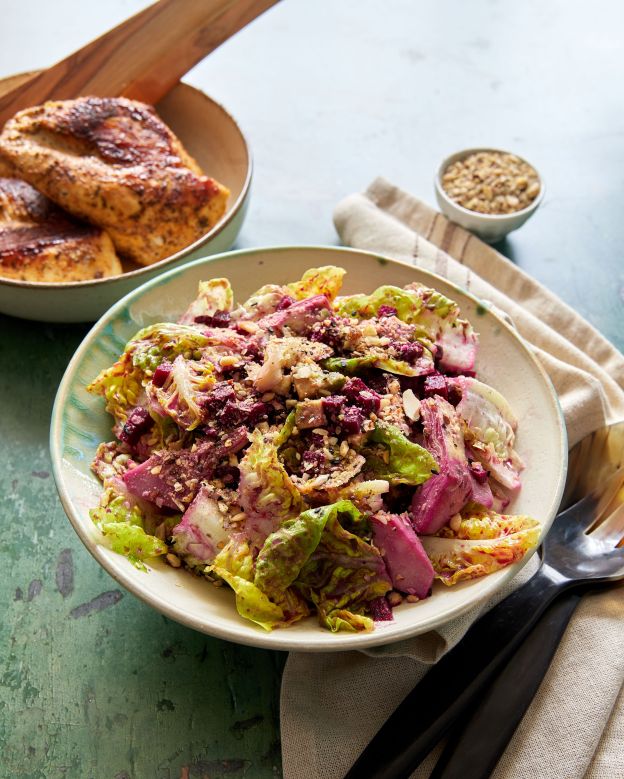 В купа смесете накъсаната салата, цвеклото, артишока и авокадото. Отделно смесете съставките за соса и разбийте добре до хомогенизиране. Залейте салатата със соса и разбъркайте. Поръсете с натрошените ядки.