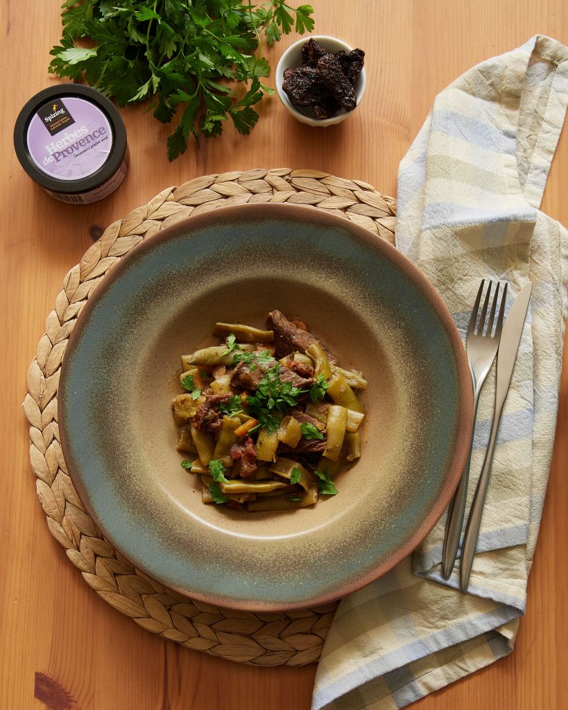 Това е гъста яхния с говеждо месо, овкусена с микс провансалски подправки и сушени домати. Аз винаги мариновам месото, защото така става по-крехко. Добре е да се планира, за да престои в маринатата (вино) поне 2 часа. Като изключим тази стъпка, приготвянето е бързо и лесно.