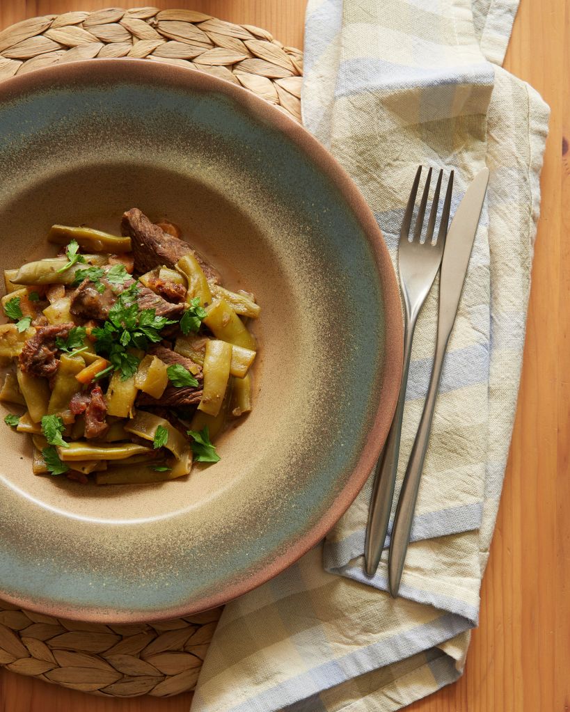 Сезонът на зеления боб наближава и днес ви предлагам една рецепта с класическия плосък сорт, с който лично аз съм израстнала. Той е чудесен източник на фибри и (като изключим граха) години наред беше единственото бобово растение, което ядях.