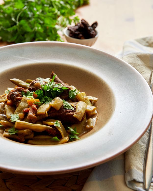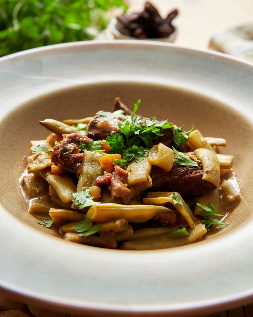 Добавете сушените домати и гответе още 5 – 10 минути, до готовност на боба и говеждото. Ако на края на готвенето има прекалено много вода, може да сгъстите соса в брашно от нахут. Сервирайте топло с пресен магданоз.