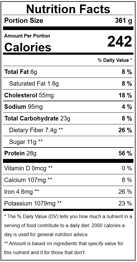 Една порция има под 300 калории, в които 28 г протеин и 7 г фибри. Може да направите и по-голямо количество, понеже този тип ястие се съхранява и претопля лесно.