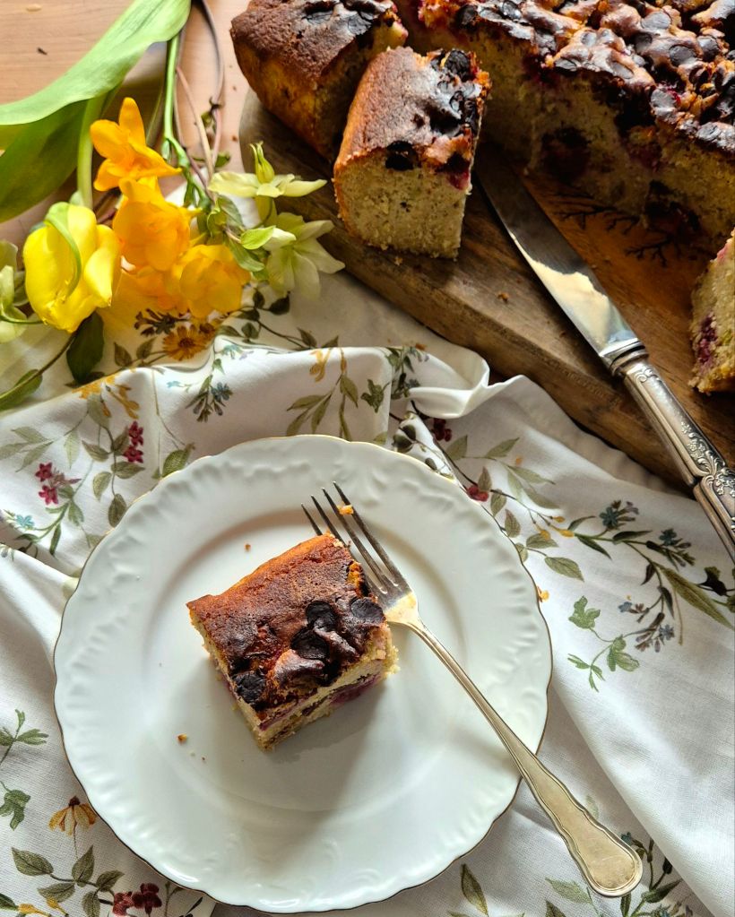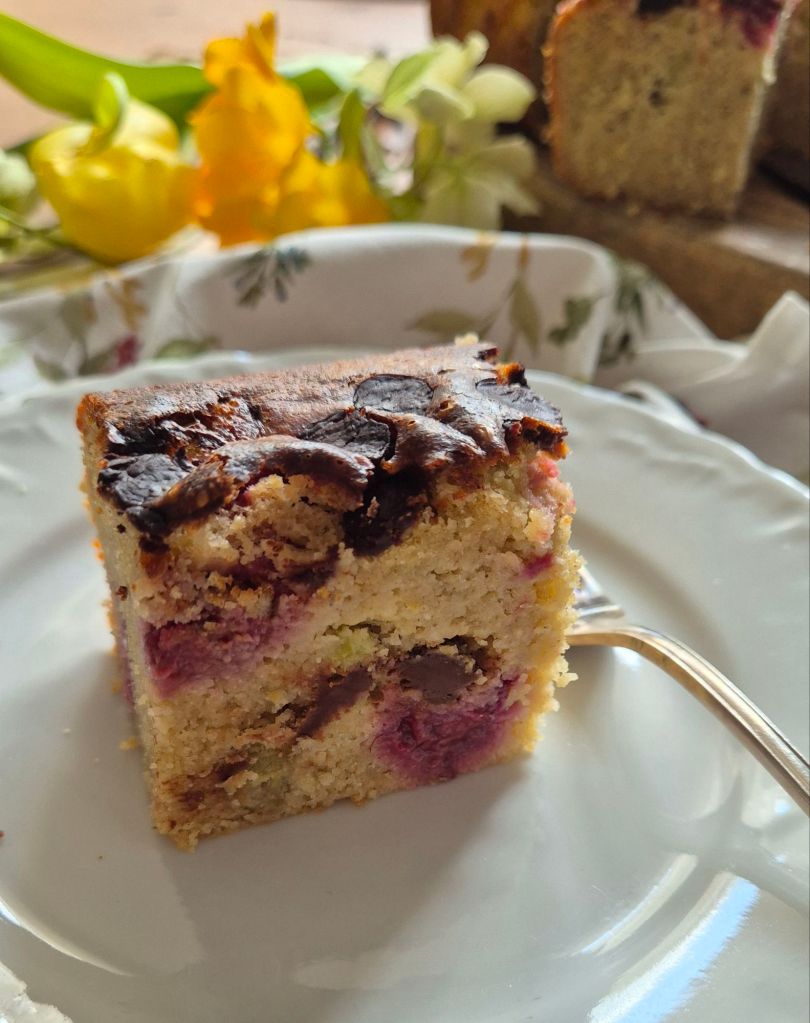Докато сме в сезона на ревена ви предлагам този свеж и сочен кейк, в който го съчетах с малини и шоколад. Той е естествено безглутенов, приготвен с брашна от елда и нахут. Освен това е приготвен със зехтин, което го прави относително по-здравословен.