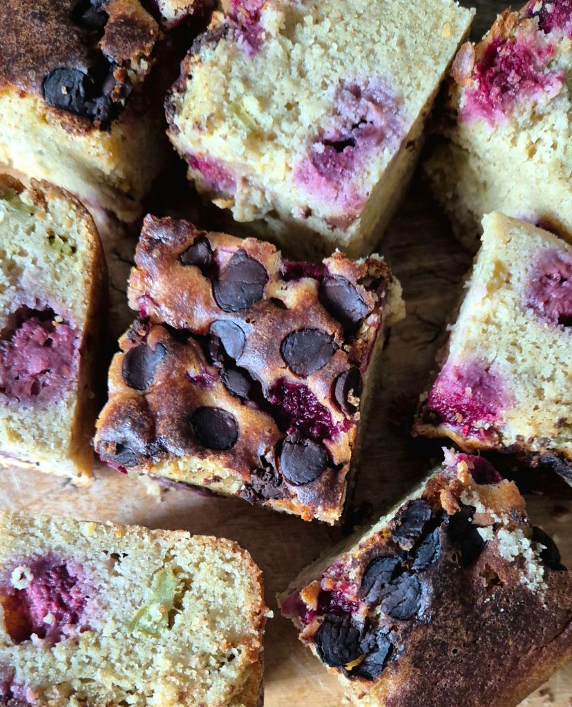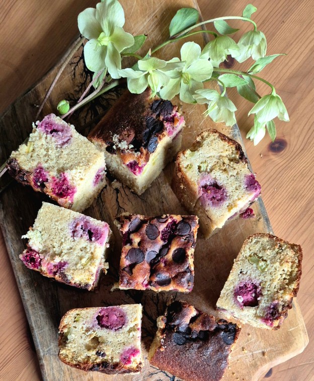 Добавете нарязания ревен и разбъркайте добре. Прехвърлете в тавата. Поръсете с малините и шоколадовите капки и печете 45 – 50 минути. Изчакайте да изстине, преди да нарежете.
