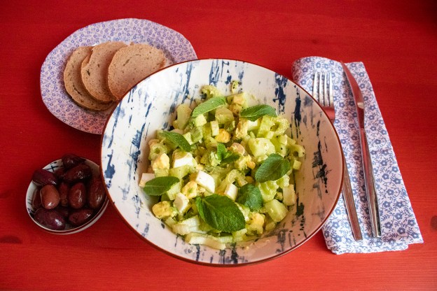 Имате ли още варени яйца от Великден? Аз имам и затова за обяд вчера направих тази много вкусна салата. Тя е изключително богата на фибри, микроелементи и витамини, защото в нея си дават среща продукти, които е добре да присъстват във всяко меню. Вписва се прекрасно в любимия ми модел „салата за основно ядене“ и е подходяща за хранене на път/пикник/в офиса, понеже се яде студена.
