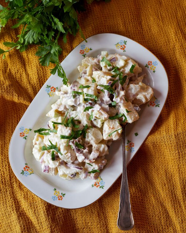 В днешната рецепта няма нищо сложно или уникално. С нея искам да припомня на тези от вас, които следят гликемичния индекс на храната си и/или следват нисковъглехидратна диета, че не е необходимо да изхвърляте картофите от менюто си. Стига само да ги консумирате сварени и охладени (напълно, за около 24 часа в хладилник). Така нишестето, което иначе ги прави неприемливи и предизвиква пикове на глюкозата, се превръща в устойчиво и не се усвоява в стомаха и тънките черва, като при това подобрява храносмилането, подхранвайки чревната флора и спомага за понижаване на кръвната захар.