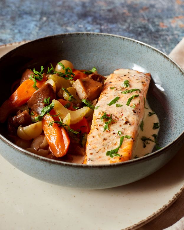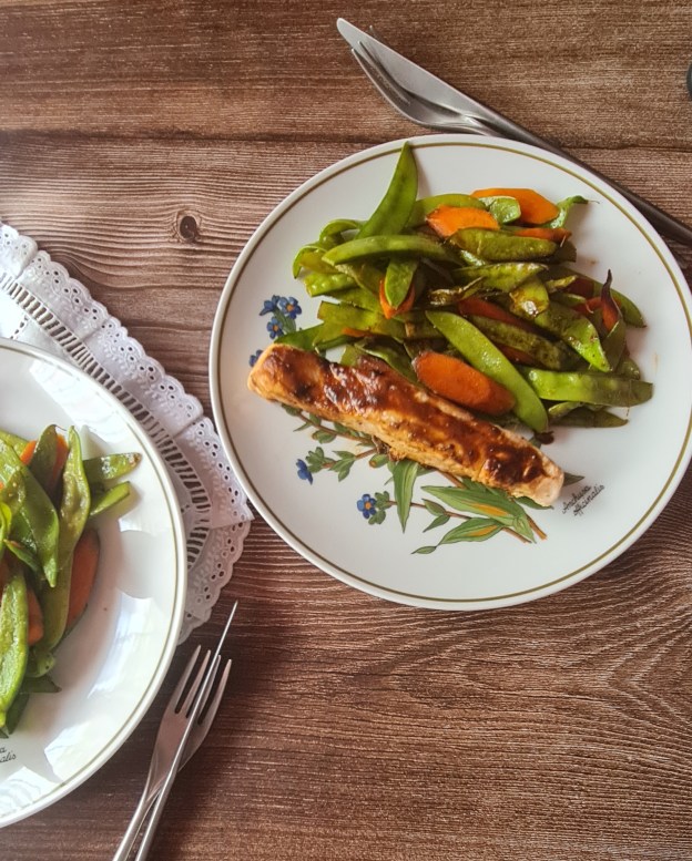 Сьомга със снежен грах, моркови и глазура от мисо и кленов сироп