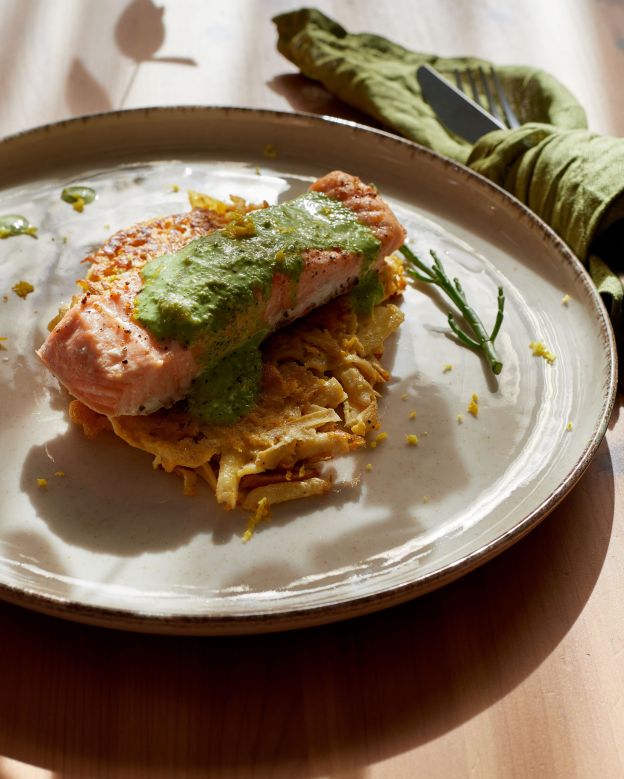 Сьомга с „рьощи“ от целина и сос със саликорния