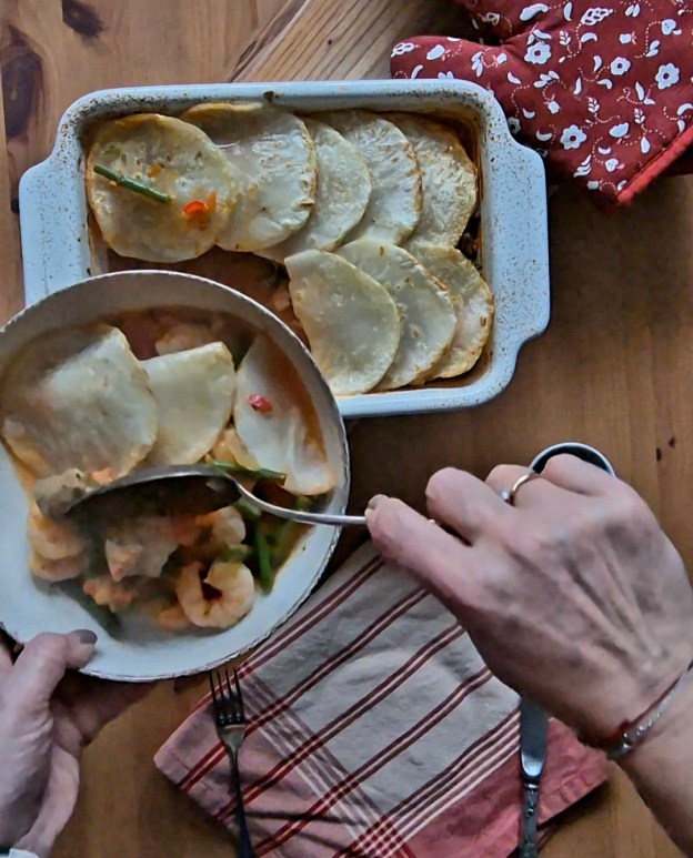 Никулден е зад ъгъла и днес искам да ви предложа една наглед сложна, но всъщност лесна за приготвяне рецепта, която можете да направите с всякакво филе от риба и с или без скариди. Името й остана от оригиналната рецепта на http://bbcgoodfood.com. Определено не е най-подходящото, или поне не се припокрива с това, което обикновено се разбира под „пай“, но не измислих по-добро.