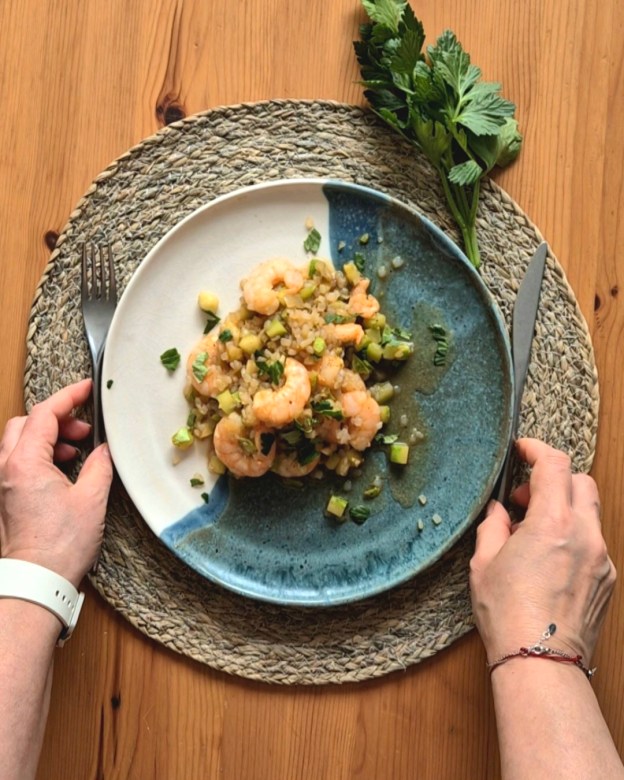 Поредното ястие в категория обяд/вечеря за под 30 минути. За него използвах „ориз чудо“ от конджак. Ако за пръв път чувате за него, конджак е кореноплодно с много високо съдържание на фибри (глюкоманан), които се продават и като добавка и предизвикват чувство на ситост. Има „ориз“ и „паста“ от конджак, но за мен пастата е прекалено далече като вкус от истинската и не е добър заместител.
