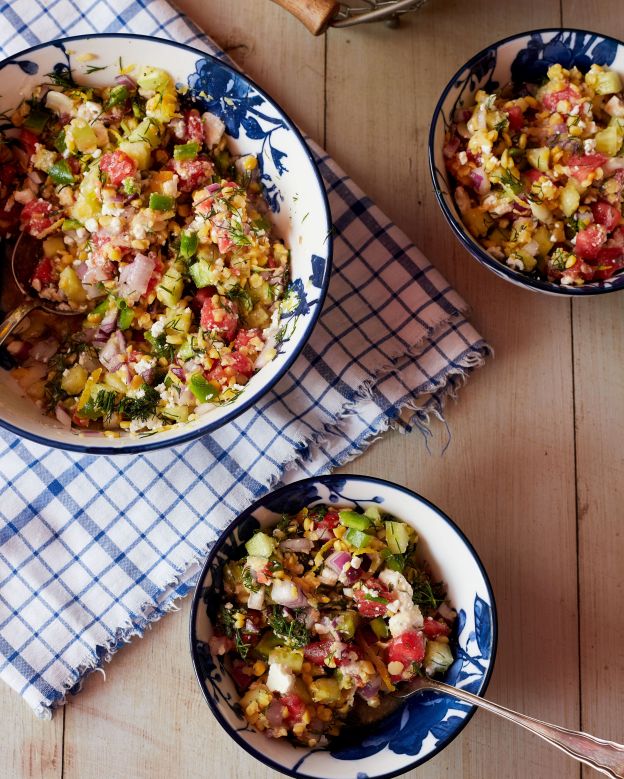 Днес ви предлагам една свежа и цветна салата с вкус на море, която може да се сервира както топла, веднага след приготвянето, така и напълно охладена. За нея ползвах тиквички, нарязани на дребни кубчета (имам един уред, който върши прекрасна работа), дребни скаридки от див улов, киноа и солени лимони.